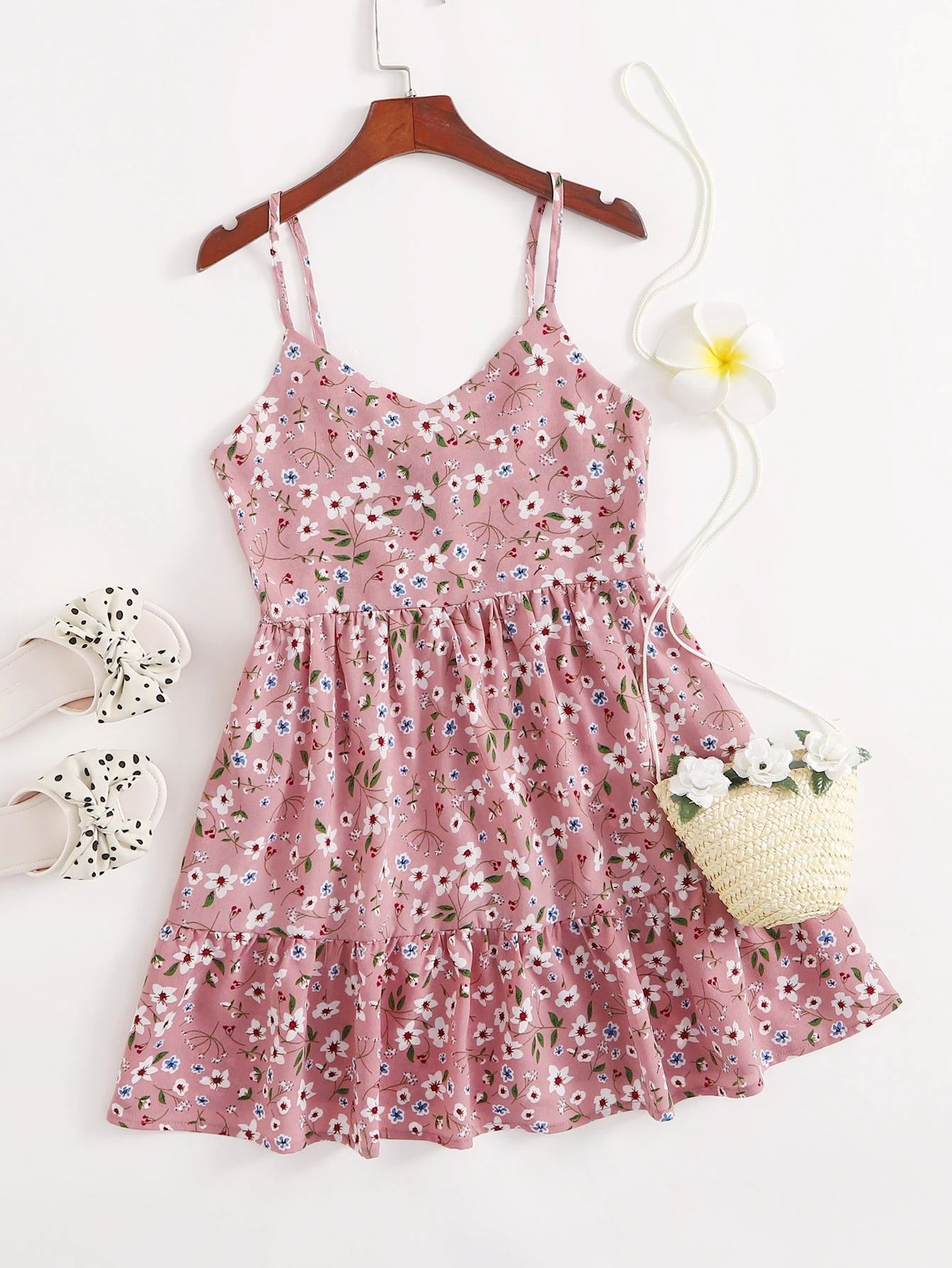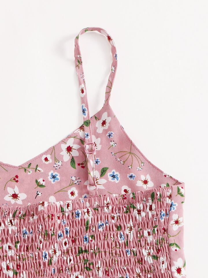 فستان منزلق مكشكش مدرز خلفي وبطباعة زهر للبنات