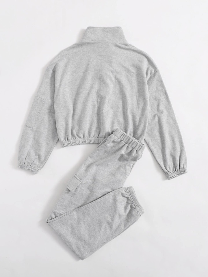 طقم سروال مع بلوفر بفتحة نصف وبسستة منخفض الكتف للبنات