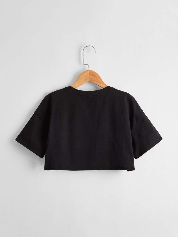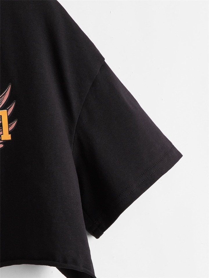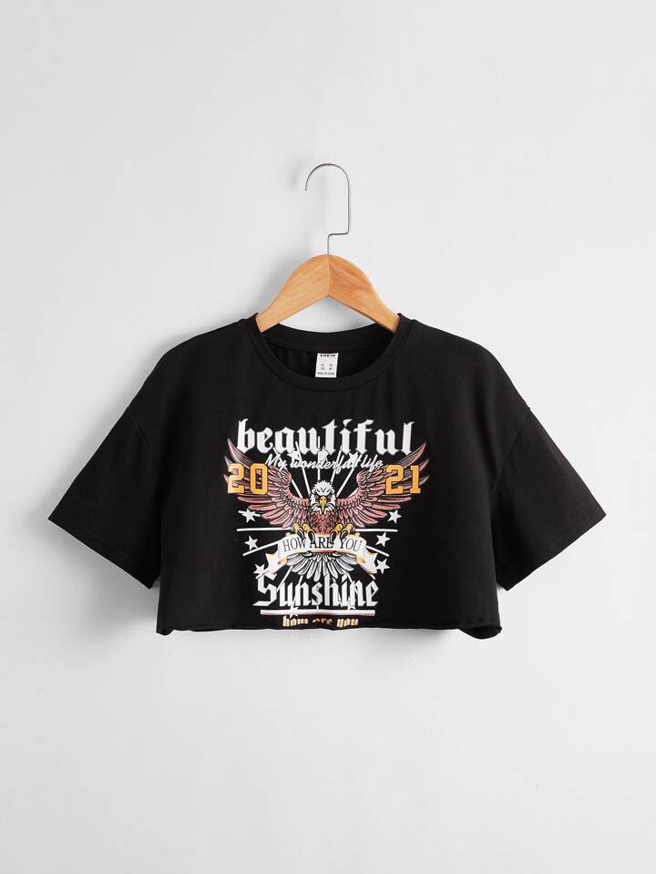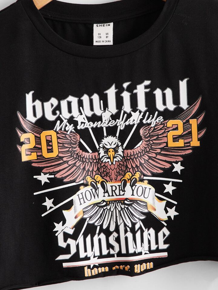 تي شيرت منخفض الكتف بجرافيك شعار ونسر للبنات