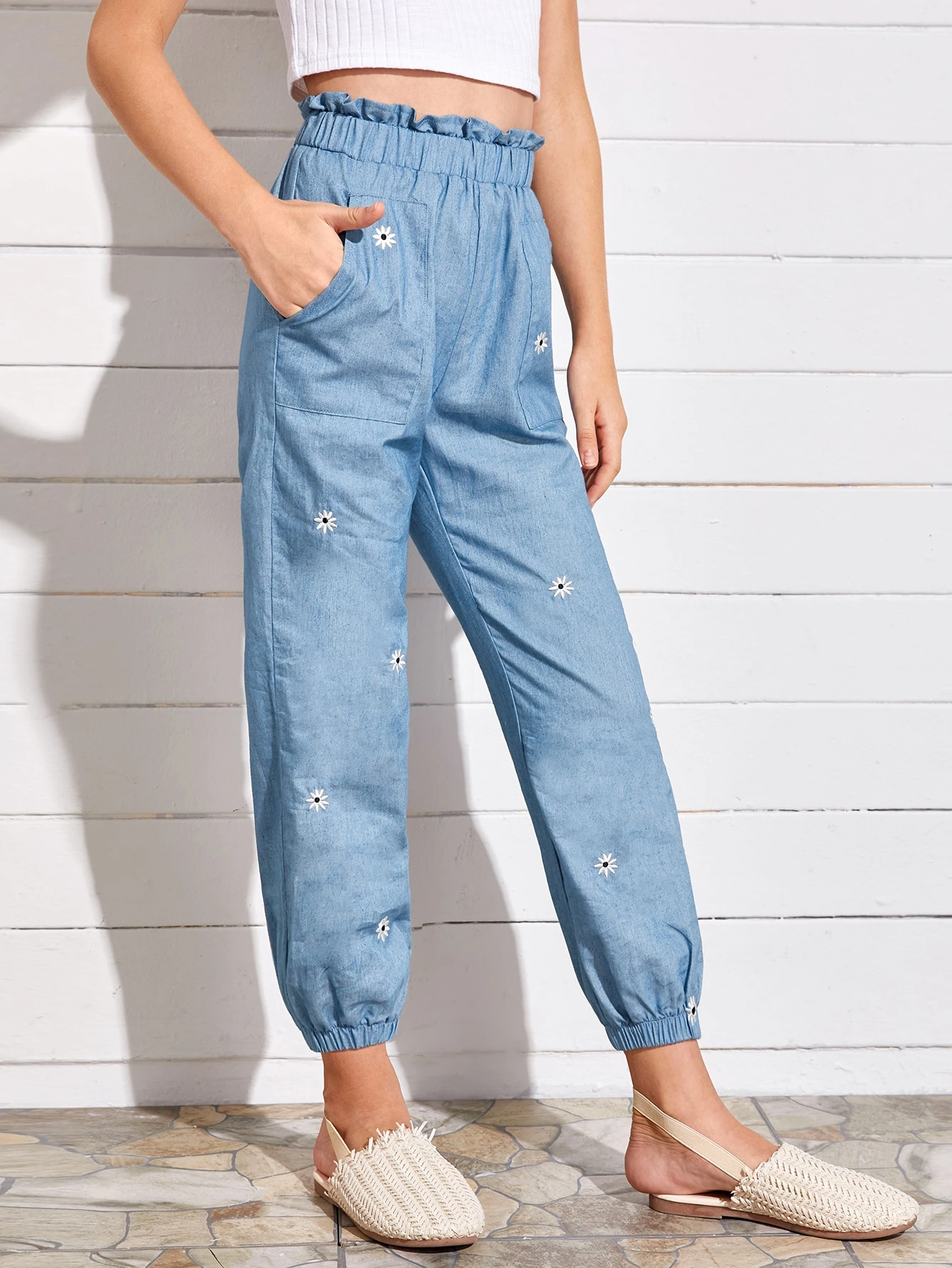 سروال مطرز بزهر وبخصر مكشكش للبنات