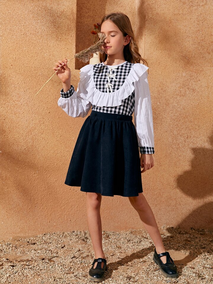 بلايز بنات عقدة الفراشة الزر مثقوب الدانتيل منتفض قماش قطن المربعات طلاب