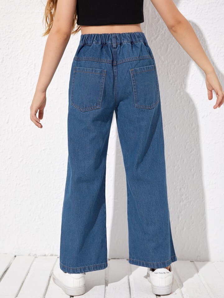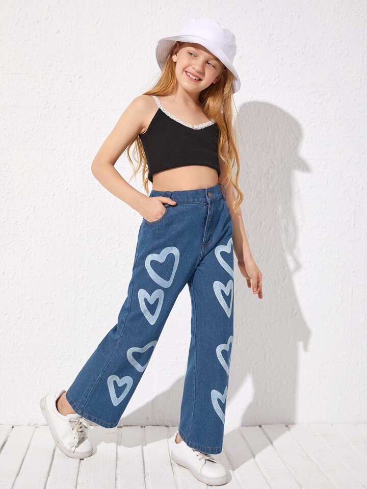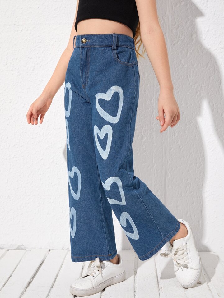 بنطلون جينز بساق واسع بطباعة قلب للبنات