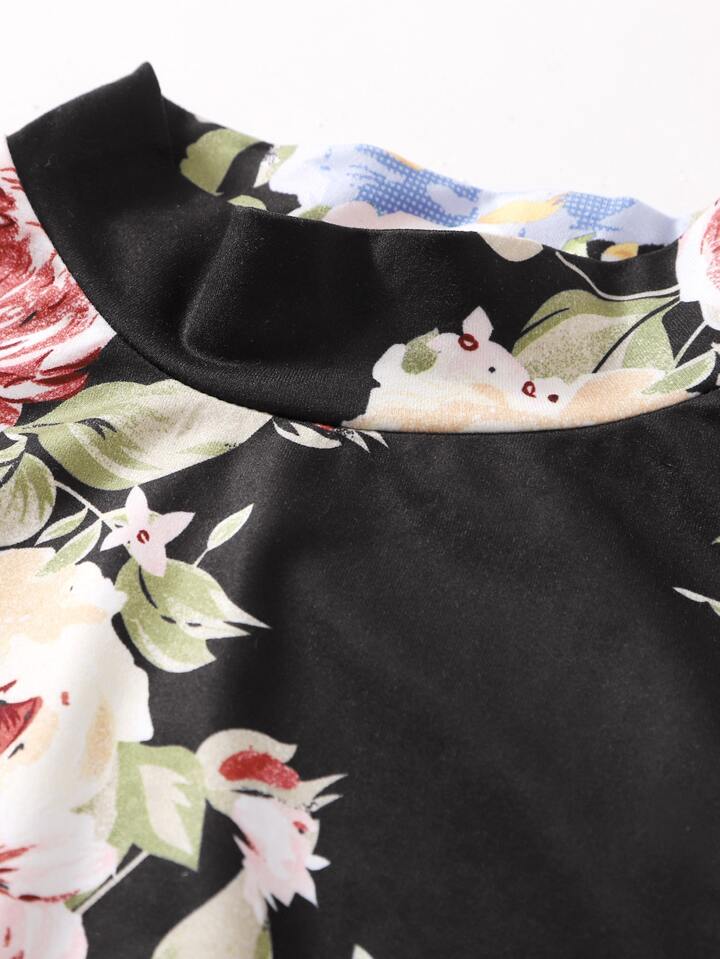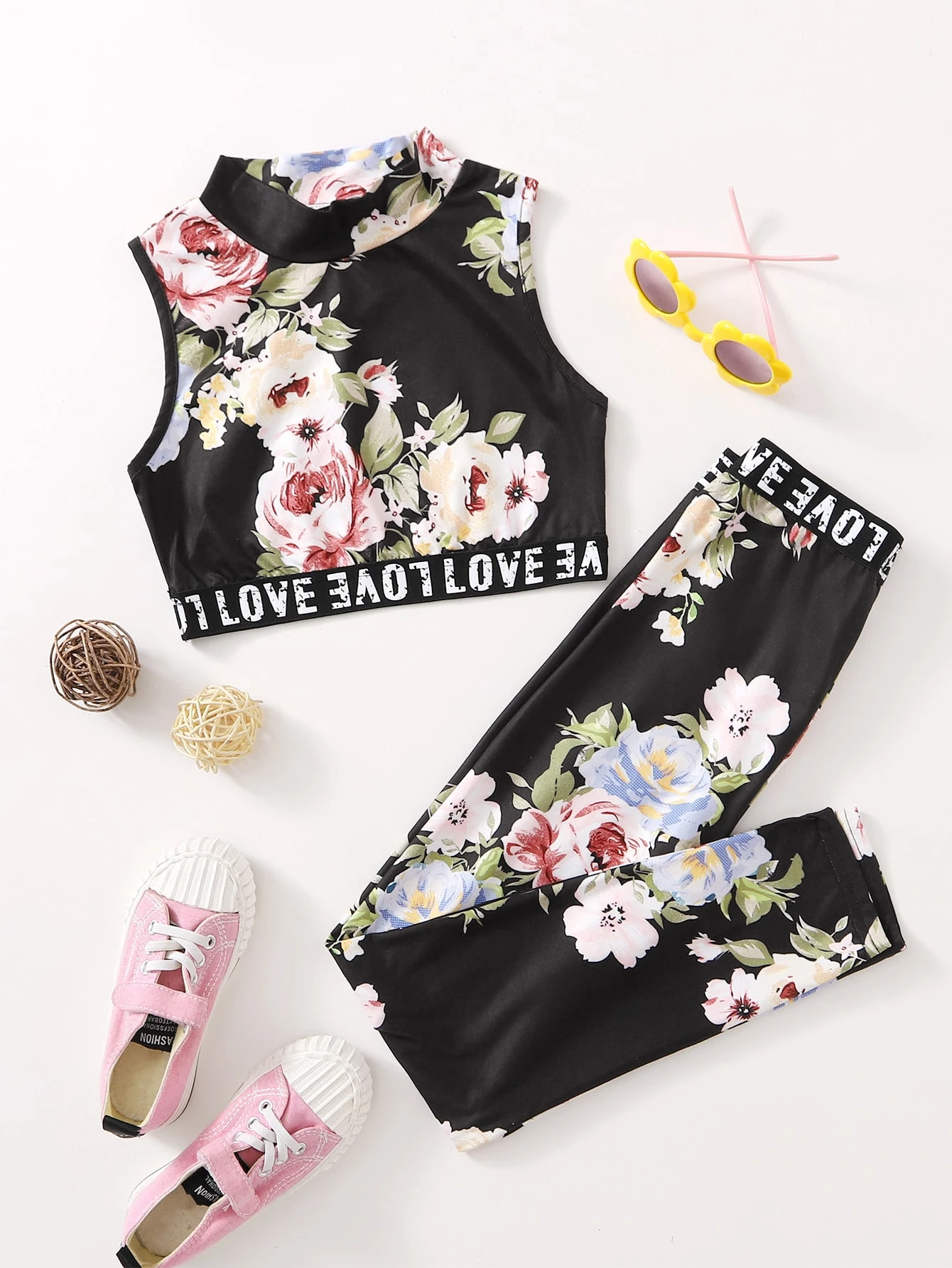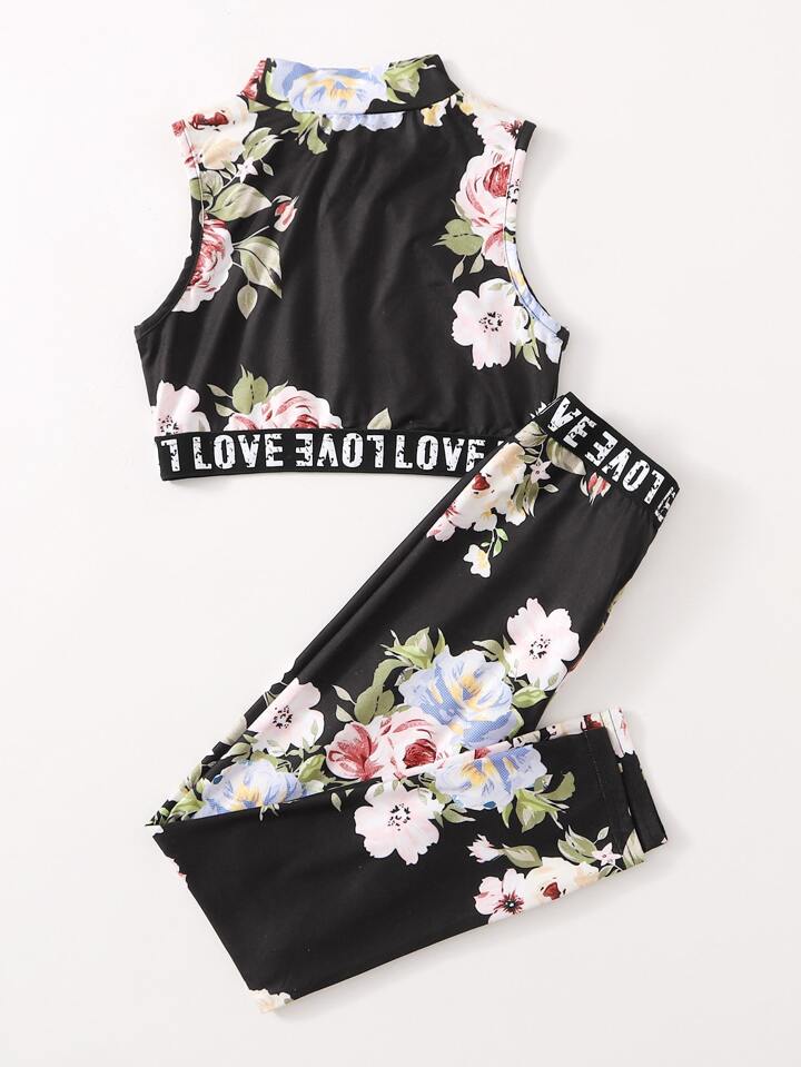 طقم طماق مع لباس علوي تانك بطباعة زهر وعبارة للبنات