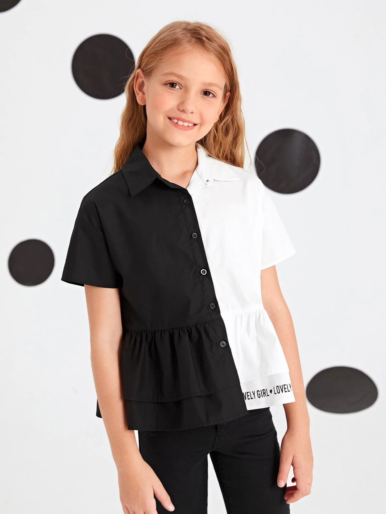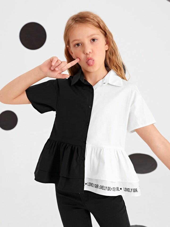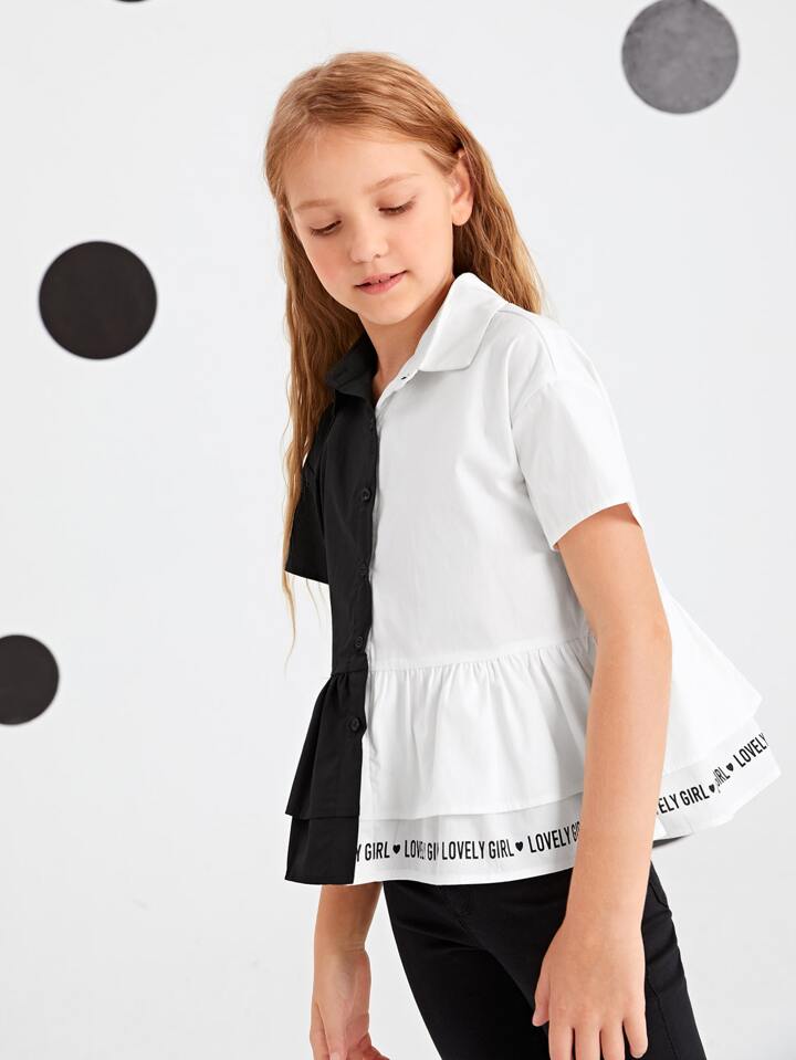 بلوزة ذو طيات بلونين وبجرافيك عبارة للبنات