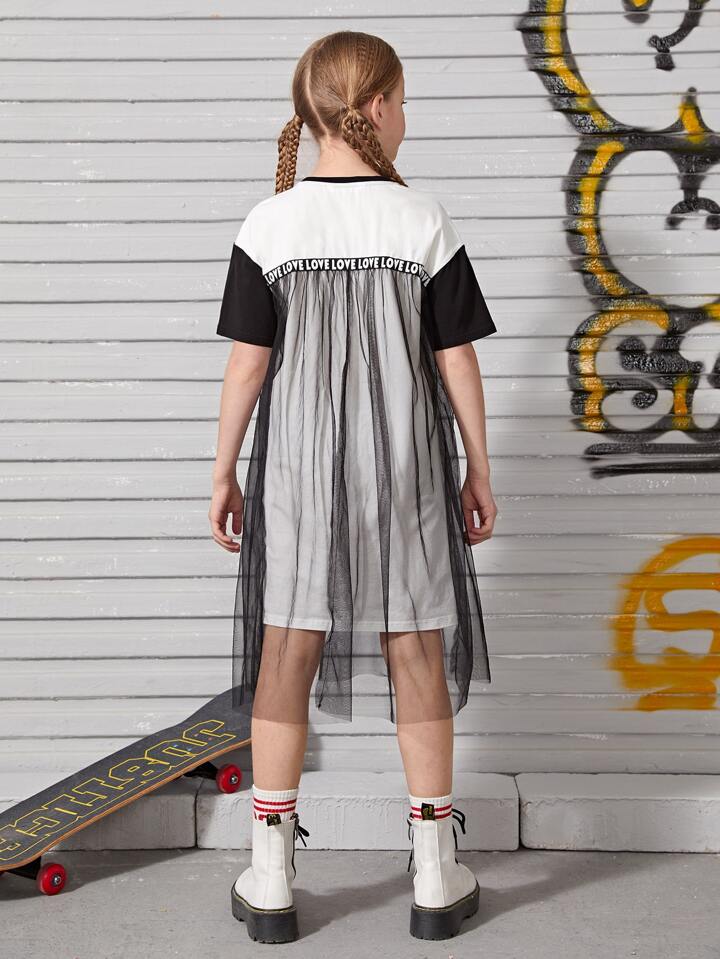 فستان بغطئ شبكي بجرافيك شكل وبشريط بعبارة للبنات