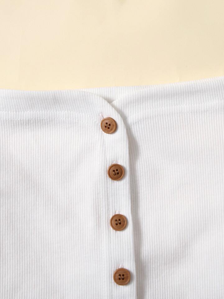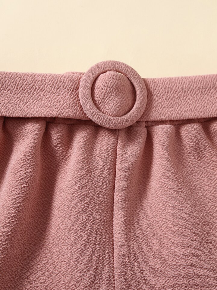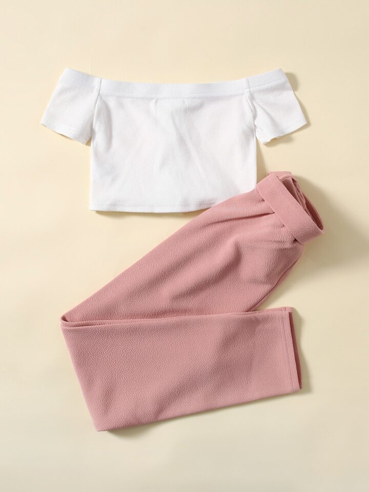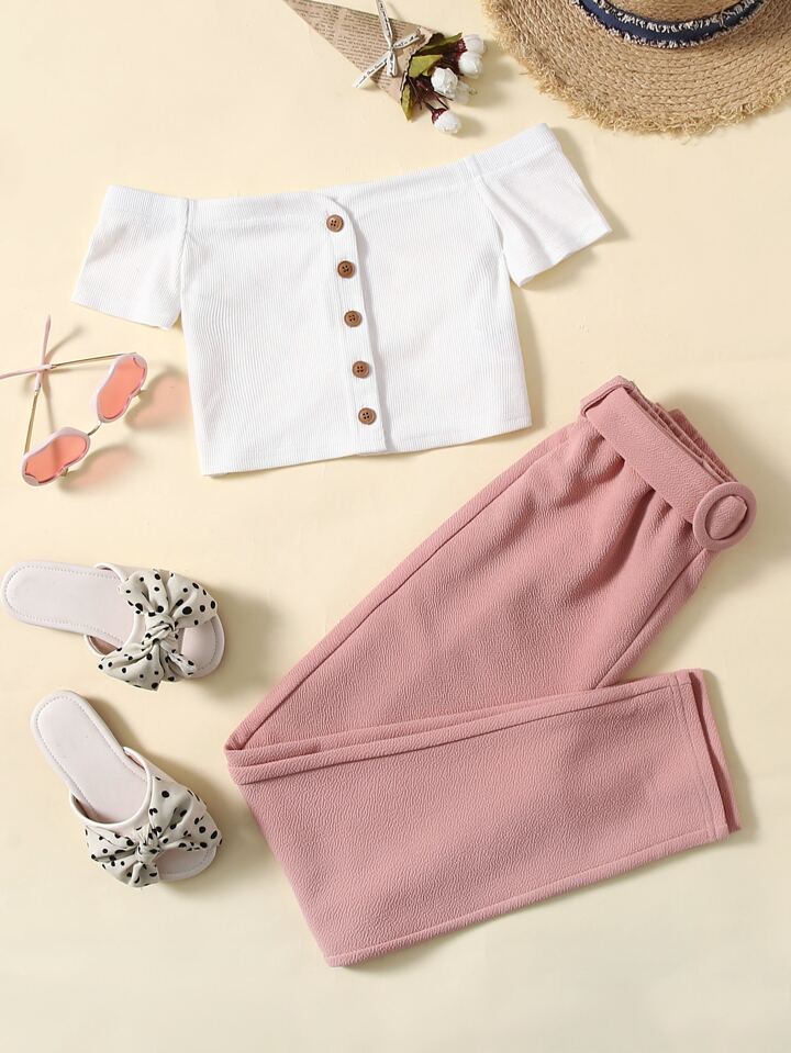 طقم بنطلون بحزام مع لباس علوي بازرار ومكشوف الاكتاف للبنات