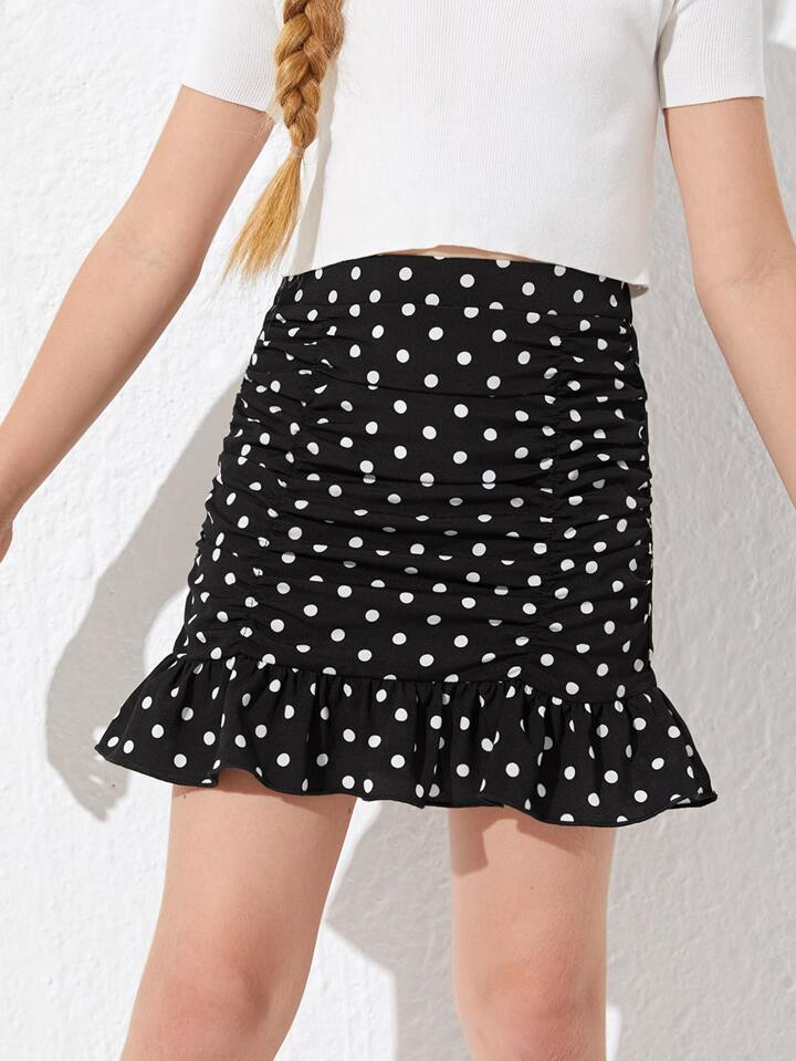 تنورة بنقاط البولكا بحافة مكشكش مزين للبنات