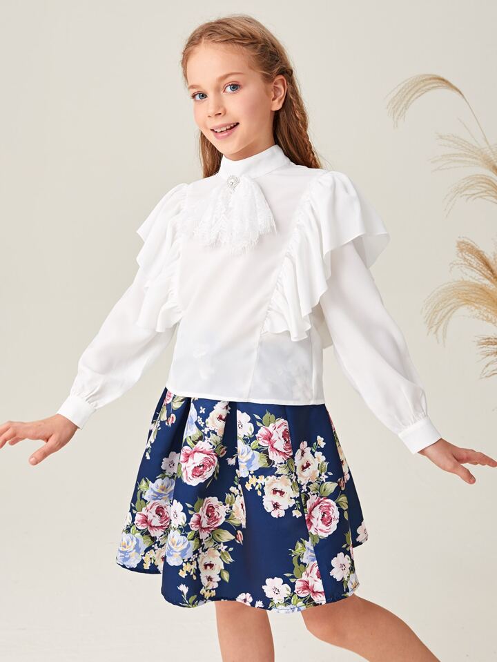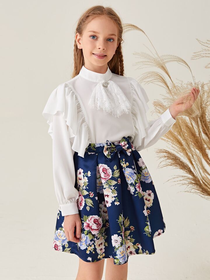 طقم توب برقبة قصيرة وأطراف مكشكشة وتنورة بطباعة زهور بنات