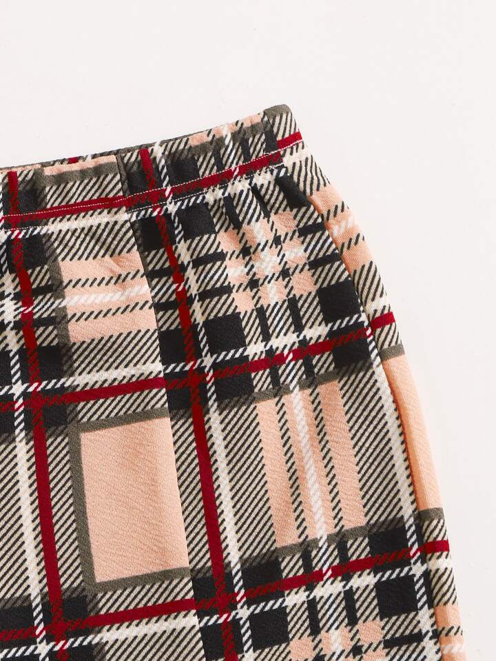 طقم تنورة مع لباس علوي تانك مربع النقش بياقة عميق للبنات