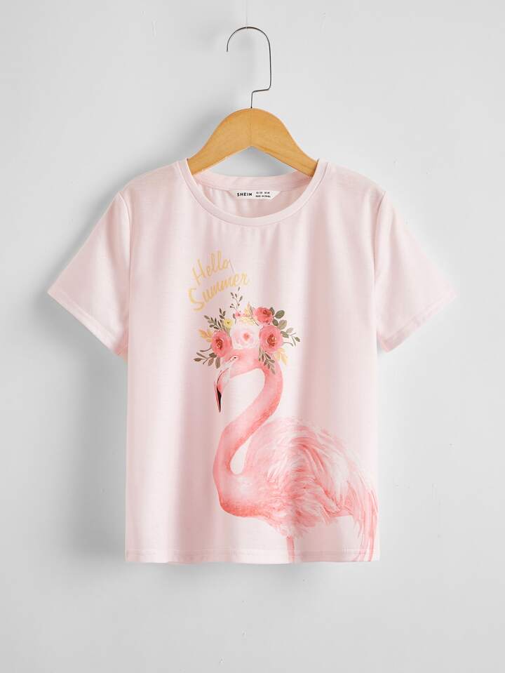 تي شيرت بطباعة طائر البشروس وشعار للبنات