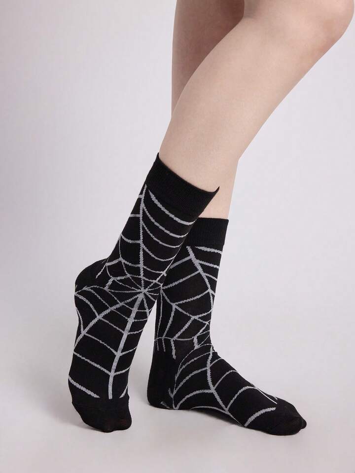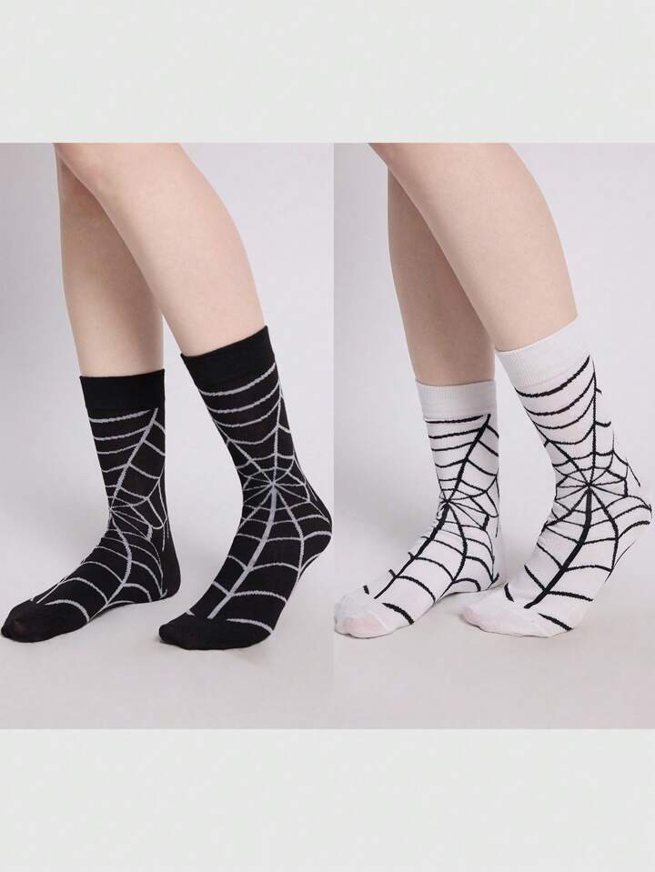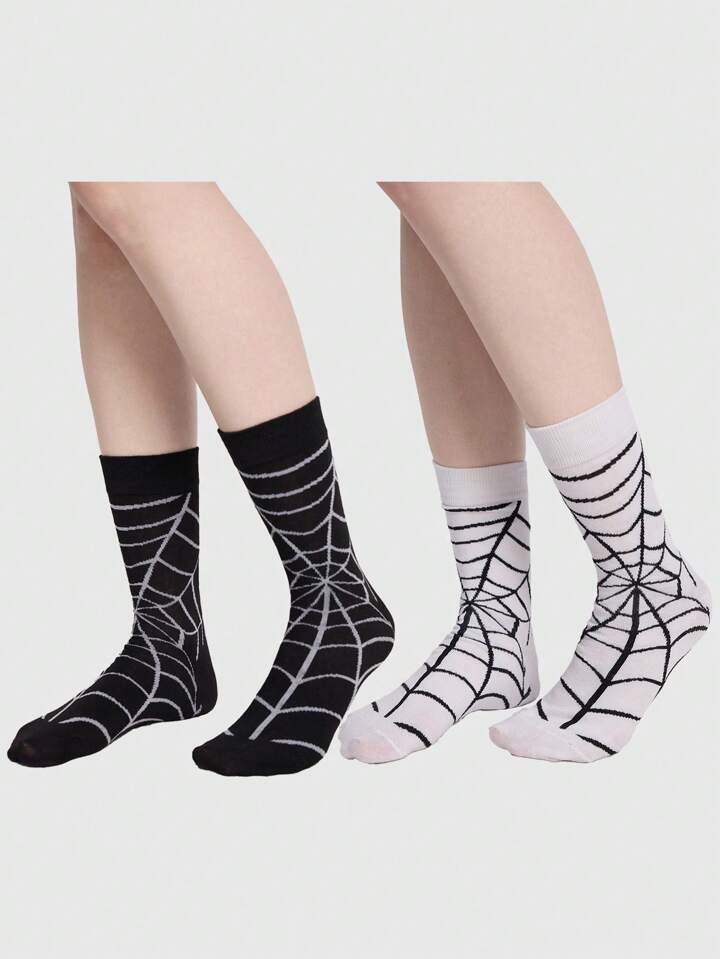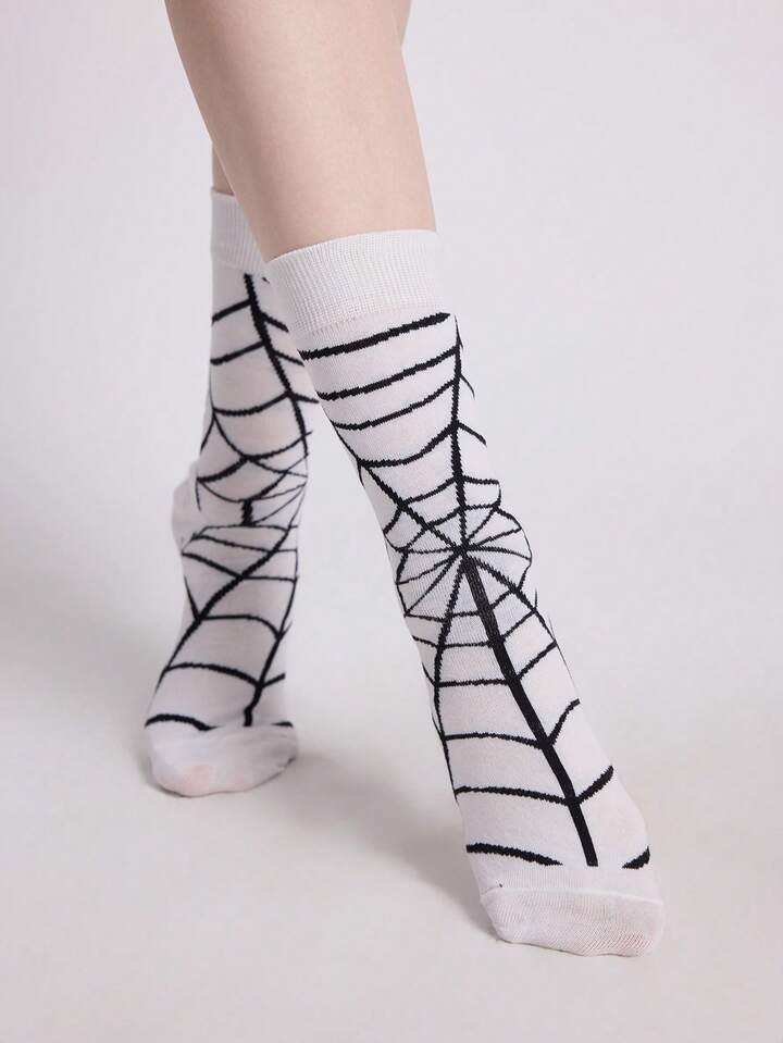 Goth زوج من الجوارب حتى منتصف الساق للنساء بنمط شبكة العنكبوت باللونين الأسود والأبيض