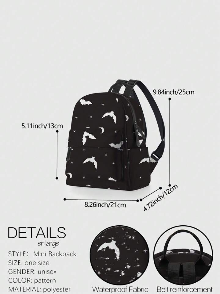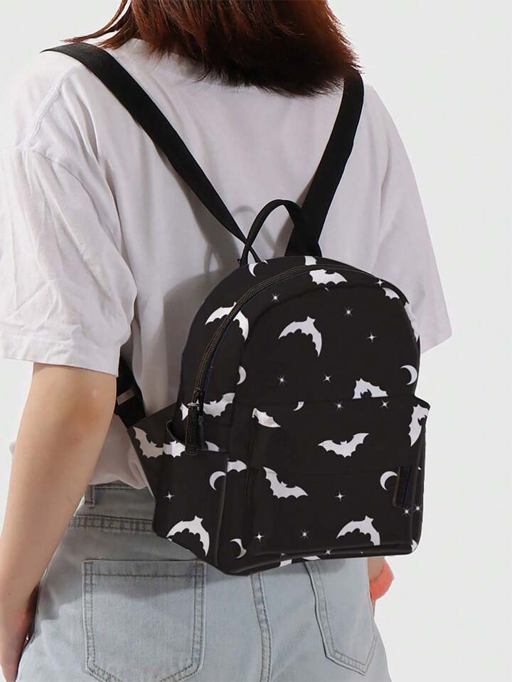 Goth حقيبة ظهر مصنوعة من البوليستر مع سحاب بنمط الخفافيش الأسود والأبيض ، هدية مثالية لموسم العودة إلى المدرسة والمناسبات. حقيبة ظهر للمدرسة ، حقيبة مدرسية ، مناسبة للمراهقات والنساء الطالبات في الجامعة ، مثالية للعودة إلى المدرسة