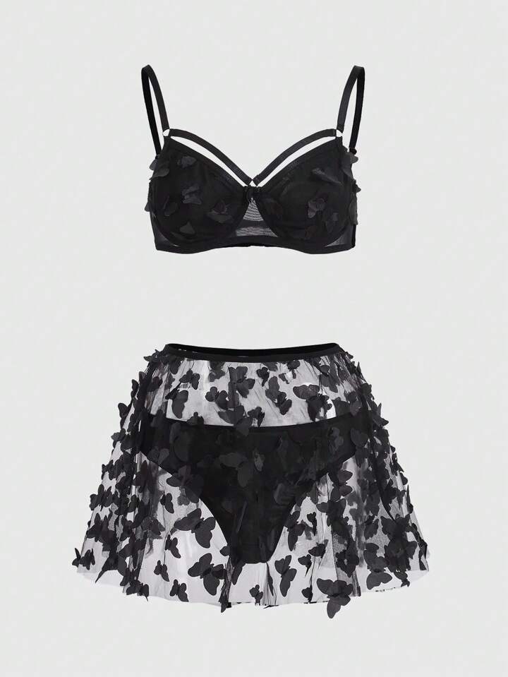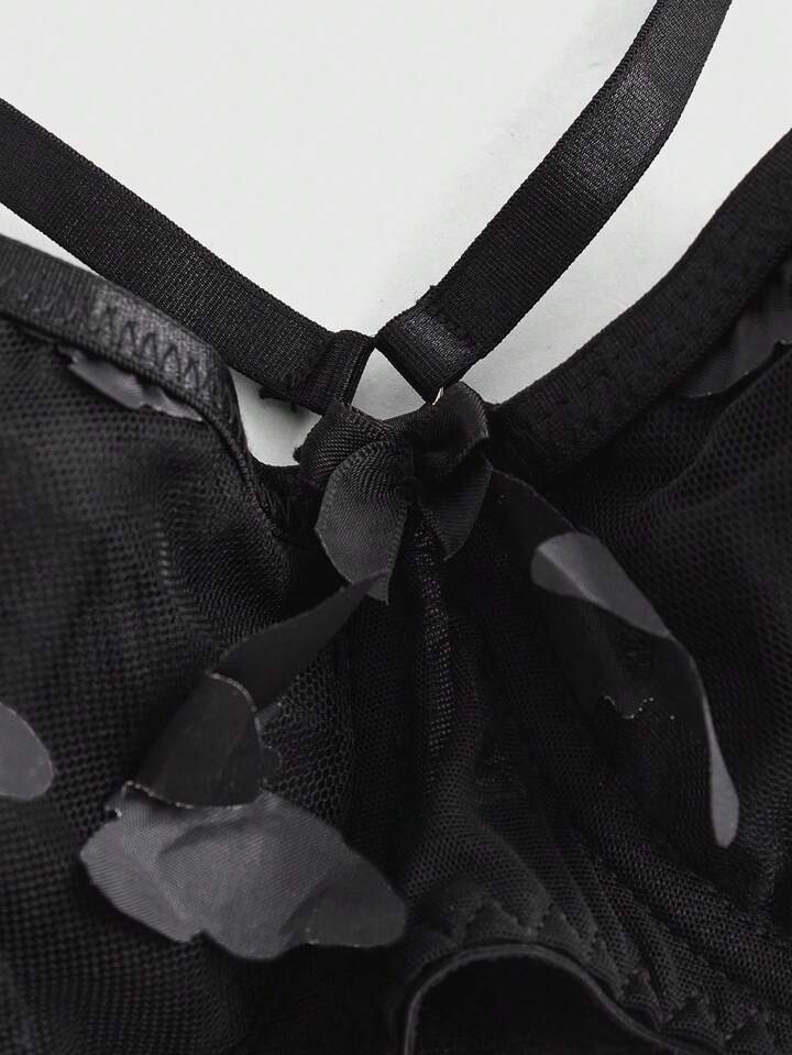 Goth طقم ملابس داخلية فراشة مزين شبكة حلقة معدني
