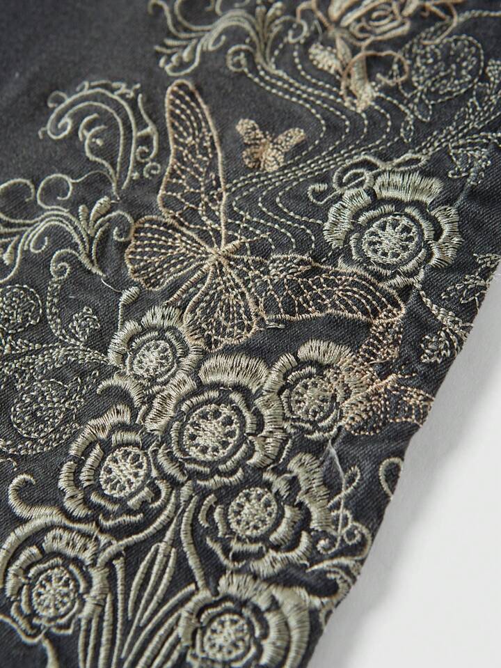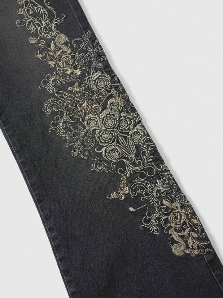 Goth جينز دنيم منقوش عصري وعملي مع تصميمات الأشجار، الفراشات، والورود واسعة أسفل