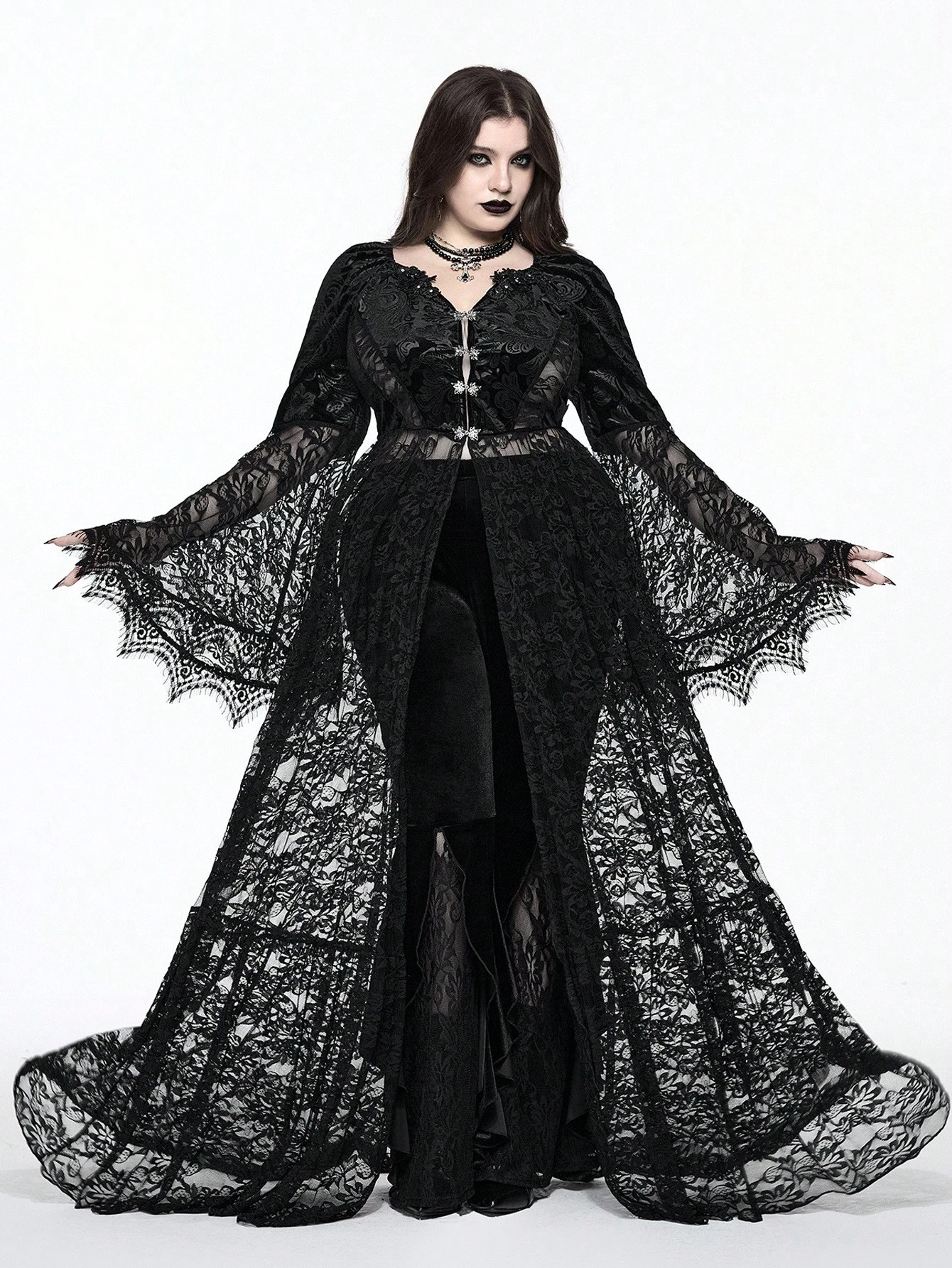 Goth فستان نسائي مريح مقاس كبير مصنوع من الدانتيل والجاكار المخمل بأكمام واسعة وذيل فضفاض، يمكن ارتداؤه كملابس خارجية مع البنطلونات أو التنانير
