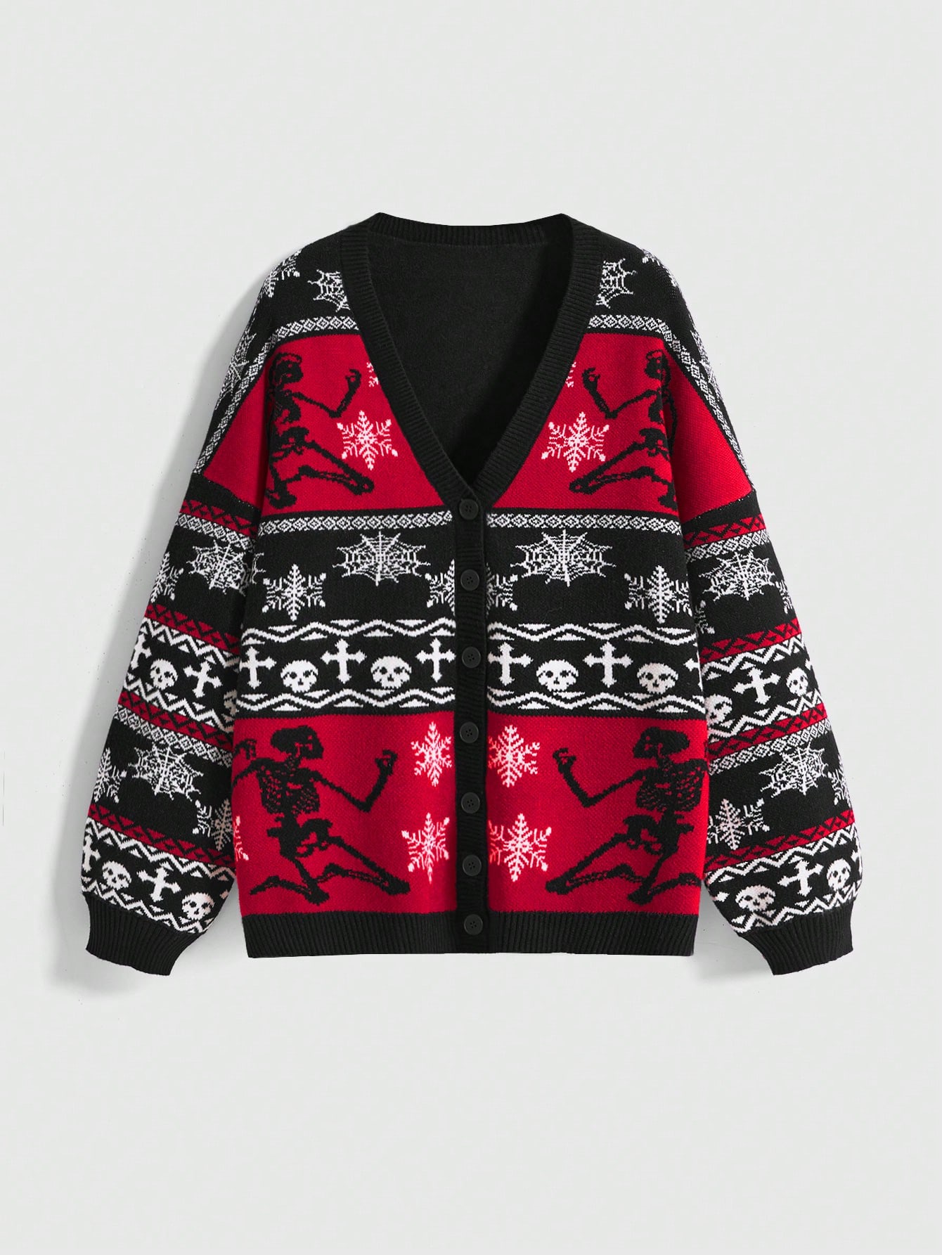Goth كارديجان محبوك بأكمام طويلة وياقة مستديرة بطبعة نجمة الثلج للنساء ذوات الحجم الكبير، مناسب للخريف والشتاء
