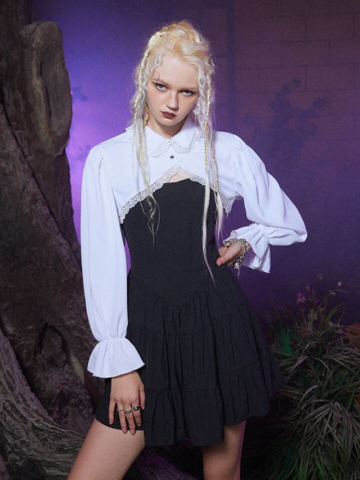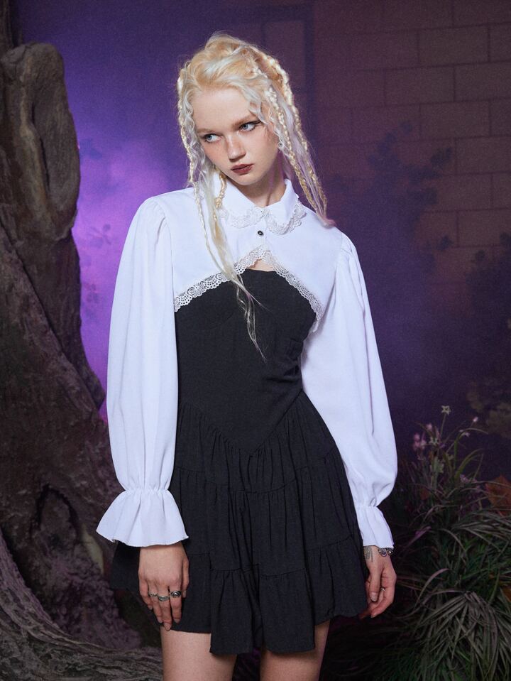 Goth لباس علوي قصير للغاية دانتيل متباين اللون أزرار أمامية
