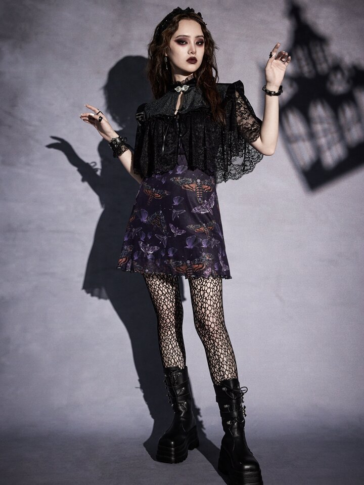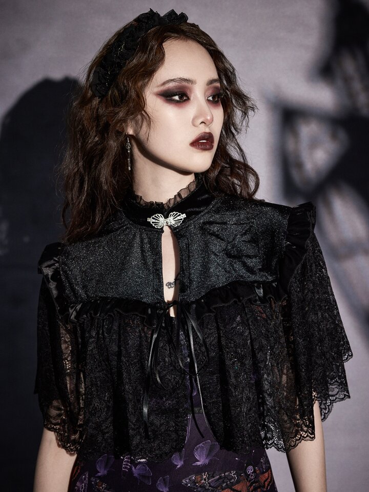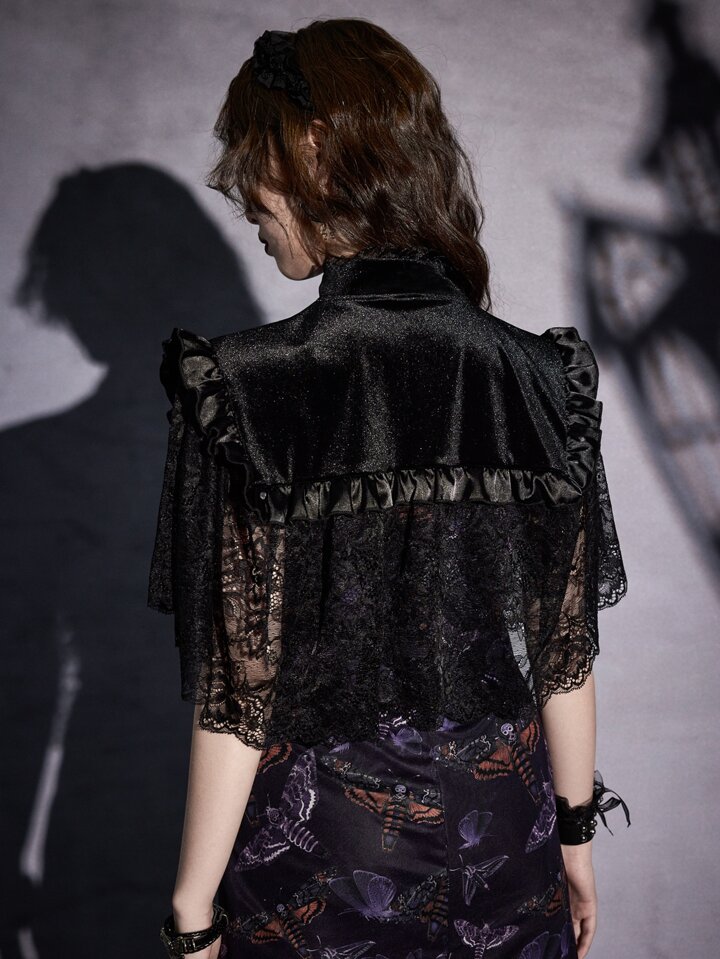Goth لباس علوي قصير دانتيل متباين اللون ربطة امامية
