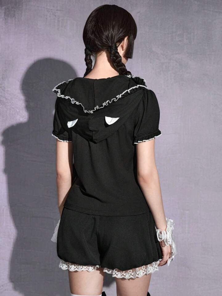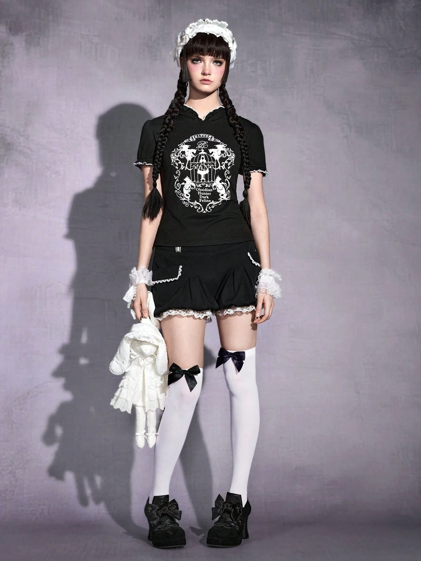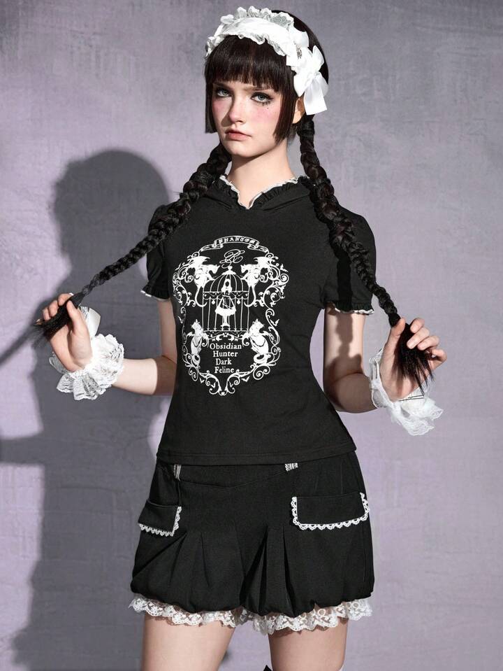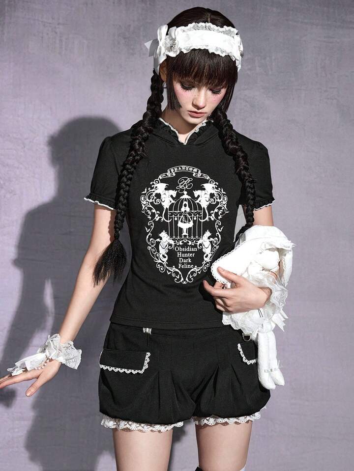 Goth قميص ضيق مع أذنين قطة بطبعات ظل فتاة مع قفص طائر وأجنحة خفافيش وكرمة داكنة