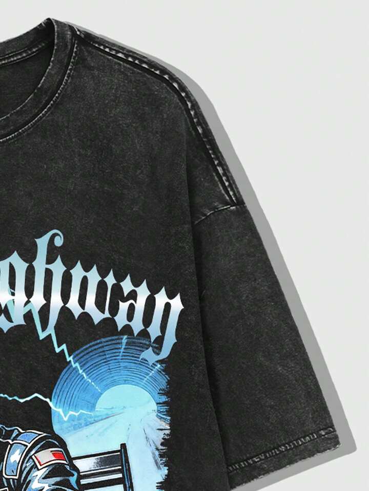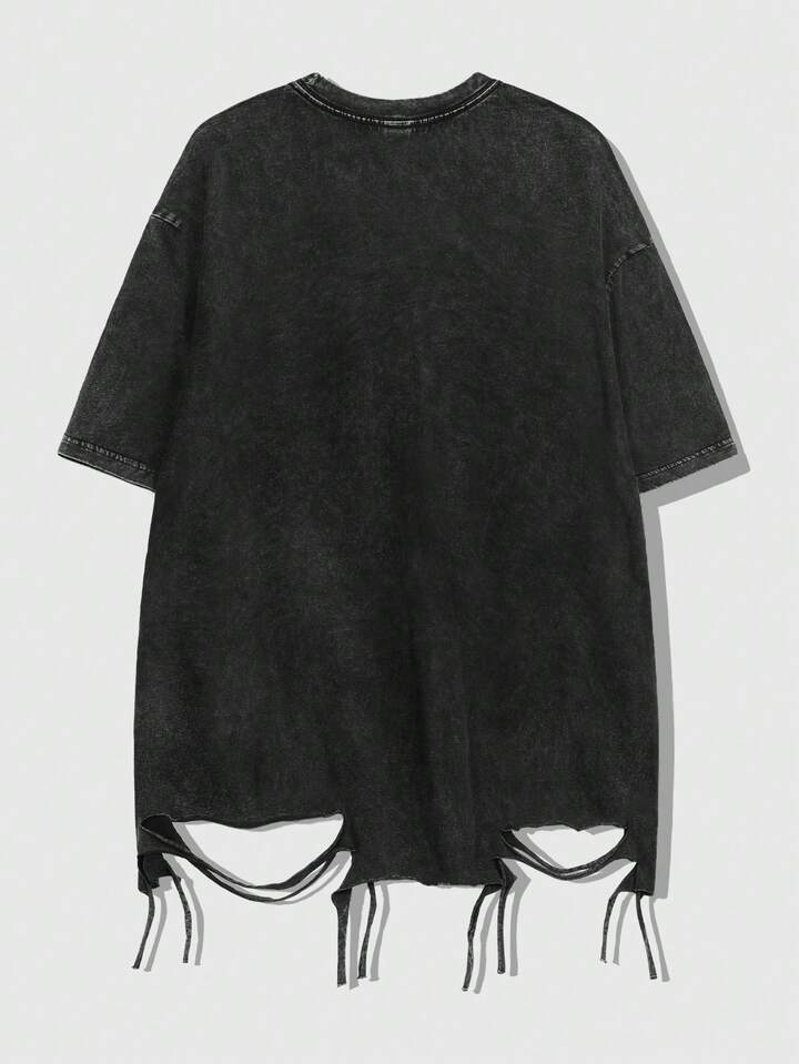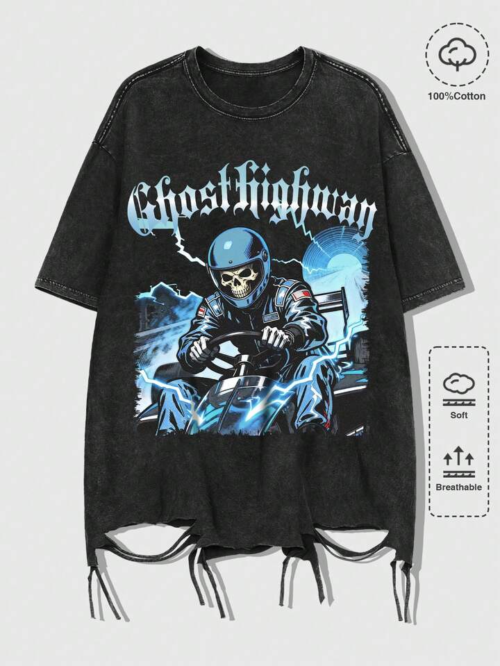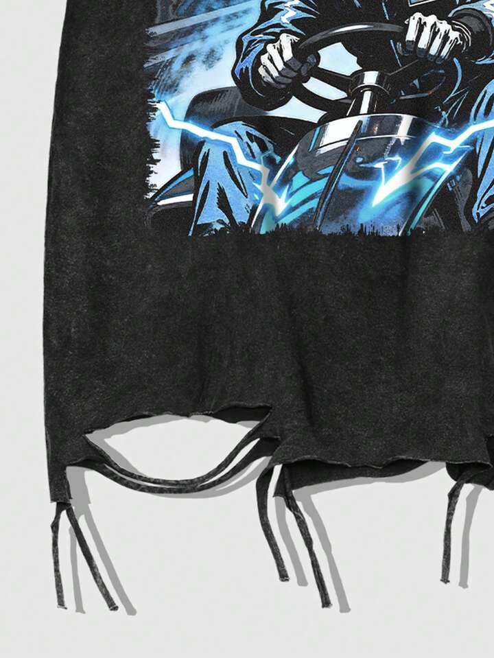 Goth تي شيرت كم قصير بطبعة هيكل عظمي مشوه وحرف