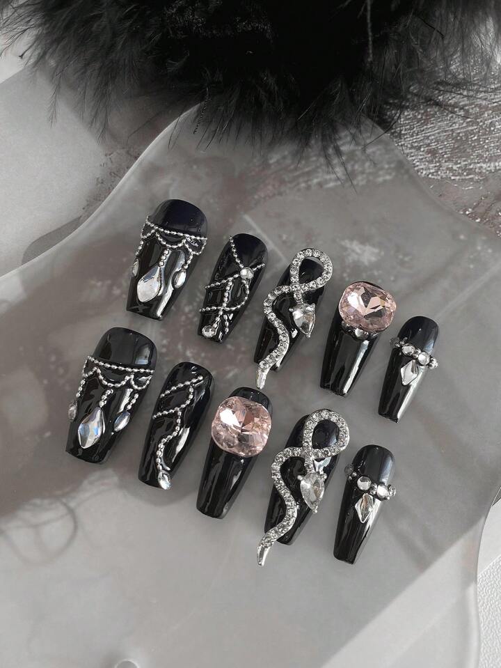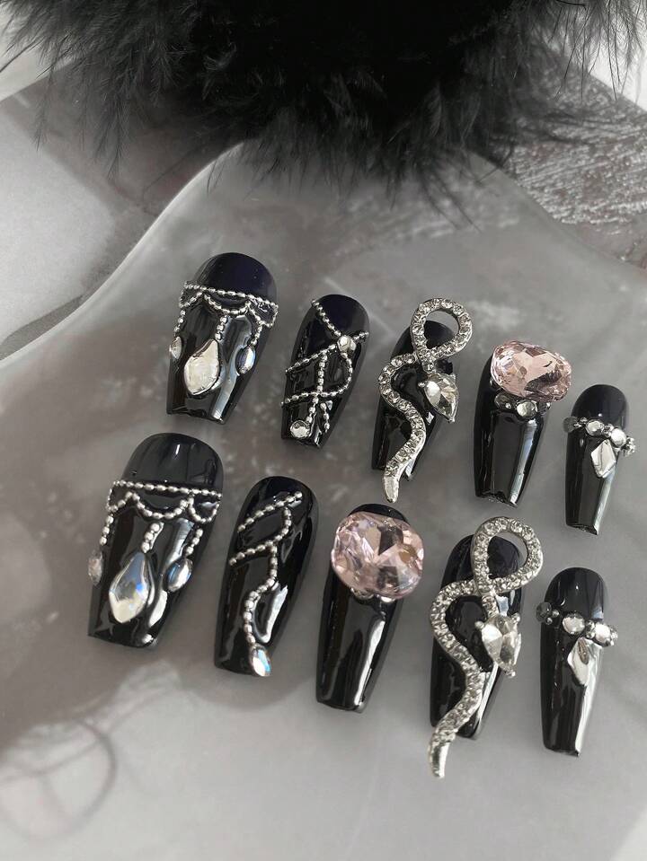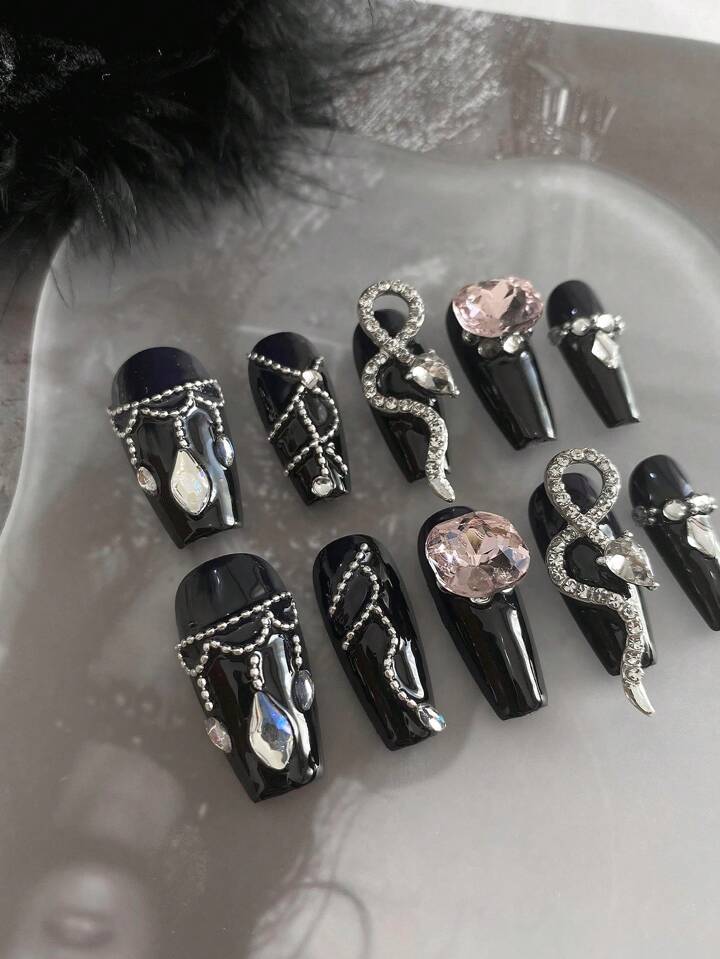 Goth (متوفر) طقم أظافر صناعية 10 قطع للأظافر الطويلة بتصميم رومانسي أسود + غراء جيلي