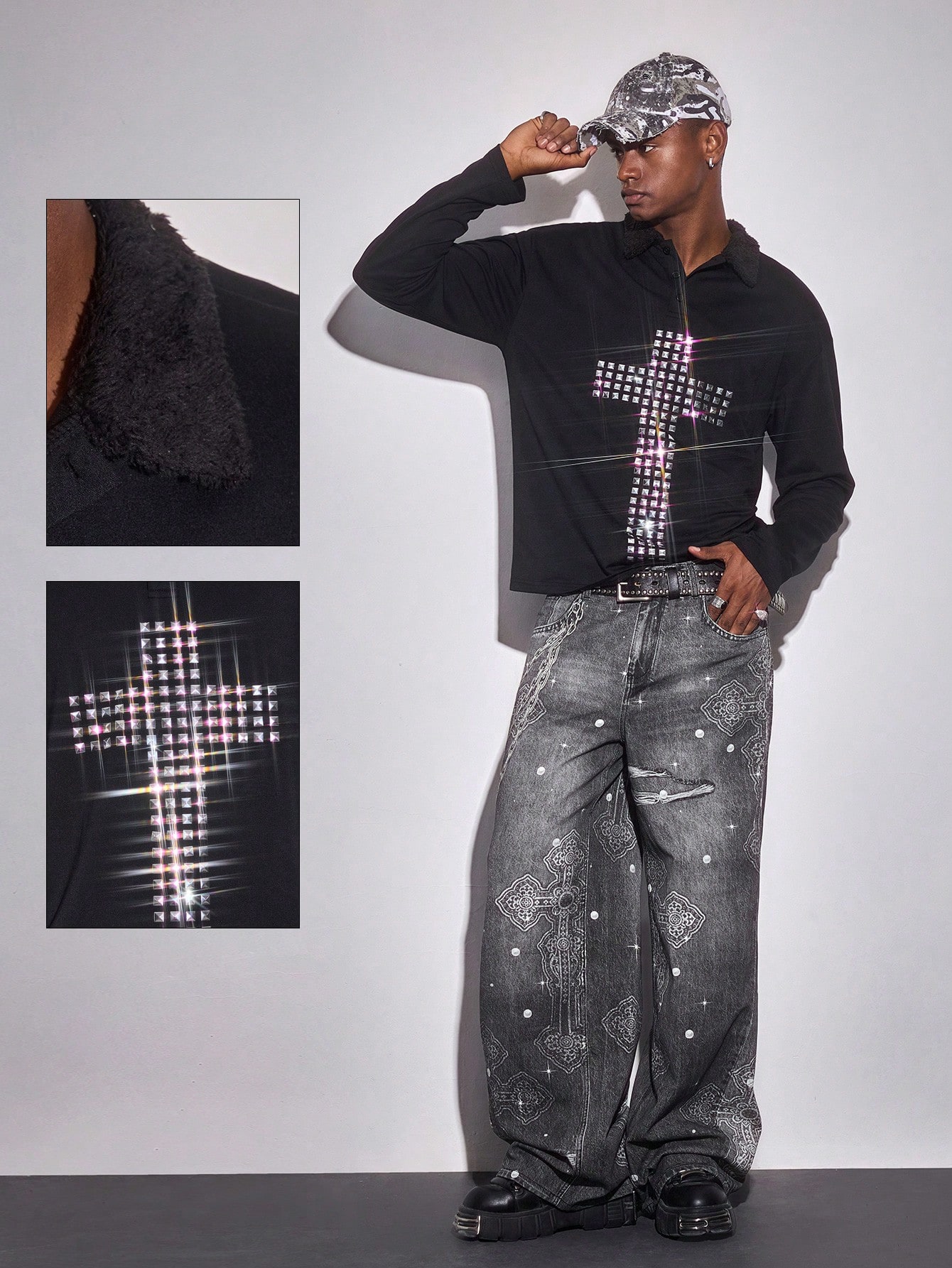 Goth قميص بولو كاجوال بأكمام طويلة بنمط الصليب للرجال