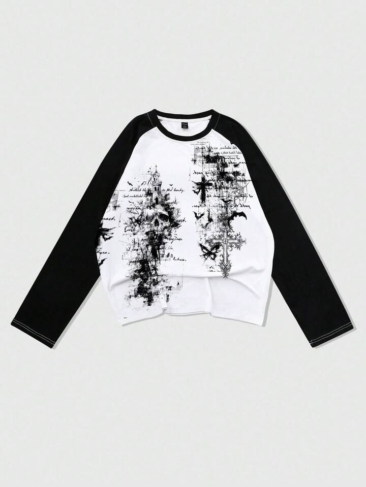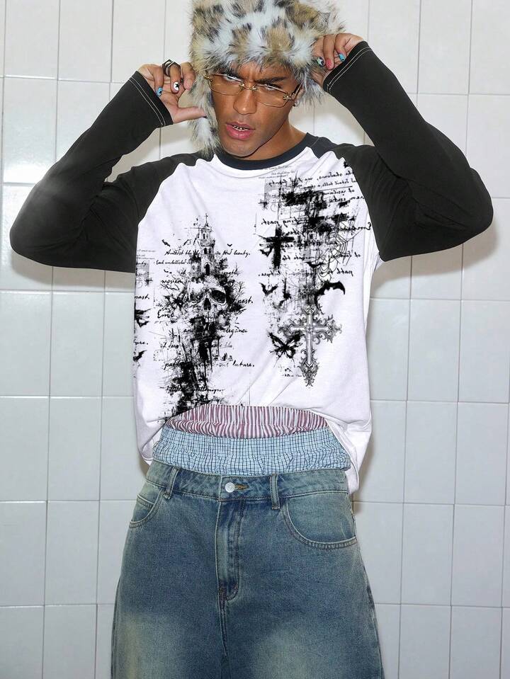 Goth تي شيرت رجالي بأكمام راجلان، كلاسيكي وأنيق، طباعة جمجمة وصليب أمامية مع عناصر داكنة، مزين بتفاصيل نصية، يحتفظ بشكل عفوي للمناسبات والأوقات الرسمية