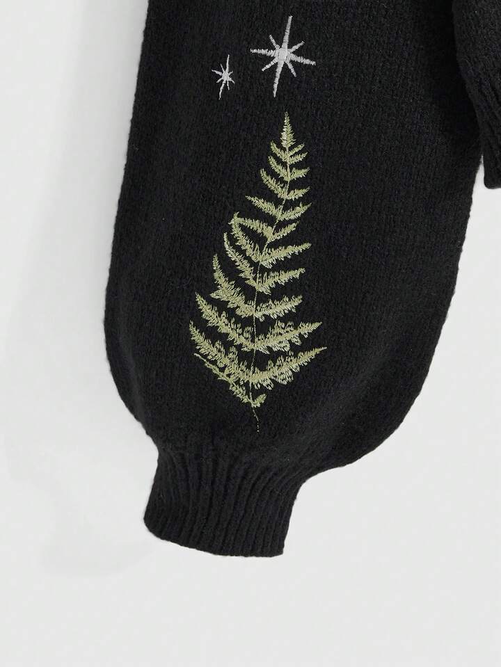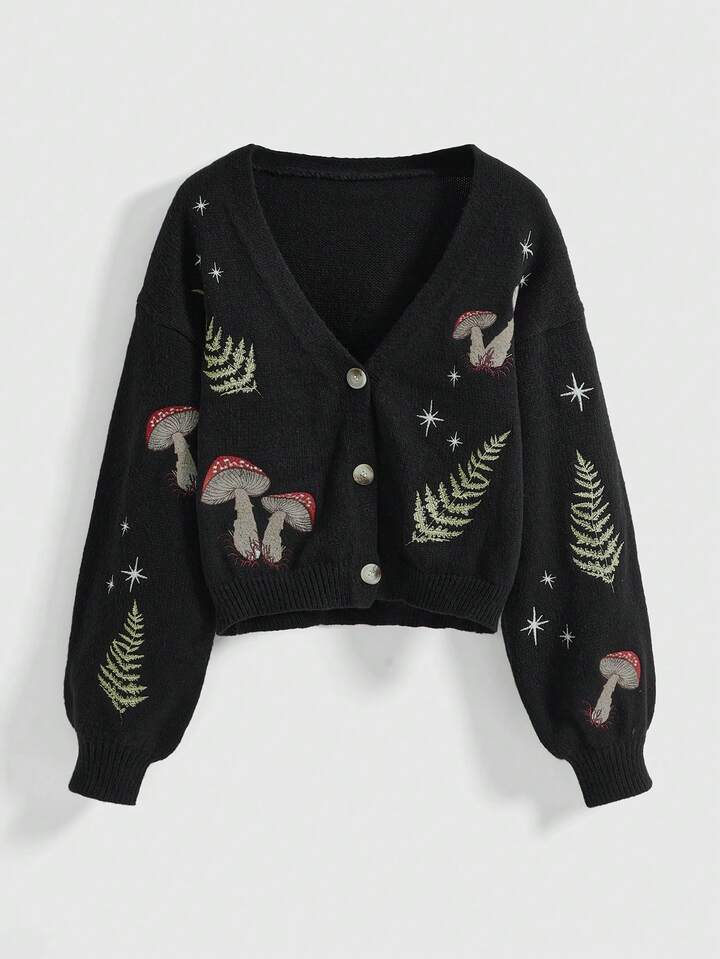 Goth كارديجان فضفاض مطرز بالفطر والأعشاب والهلال القمري للنساء مستوحى من الطبيعة
