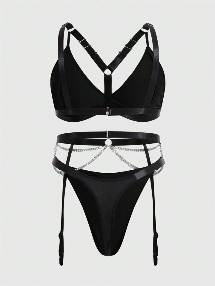 Goth طقم ملابس داخلية بتفاصيل السلسلة رباط ساق مقاس كبير