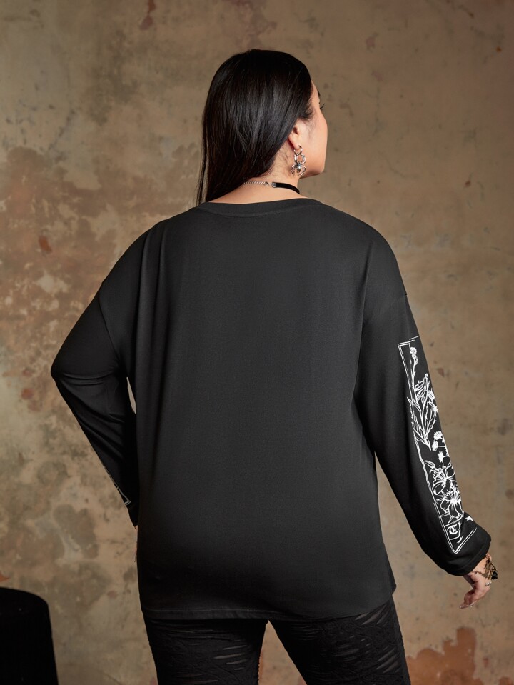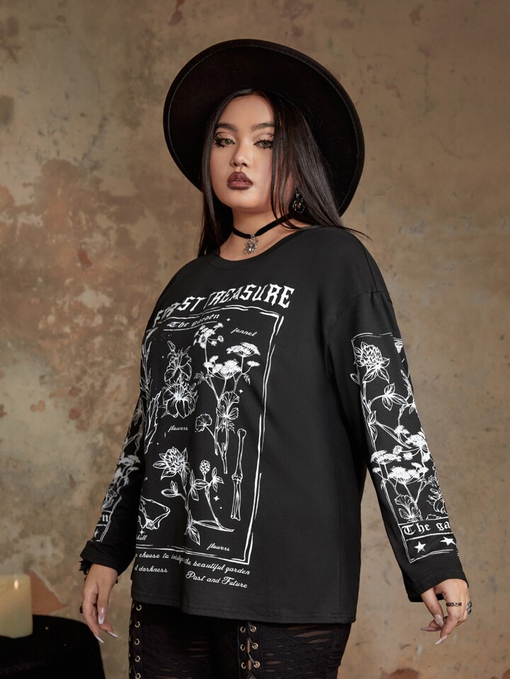 Goth تي شيرت منخفض الاكتاف بجرافيك زهر وعبارة مقاس كبير