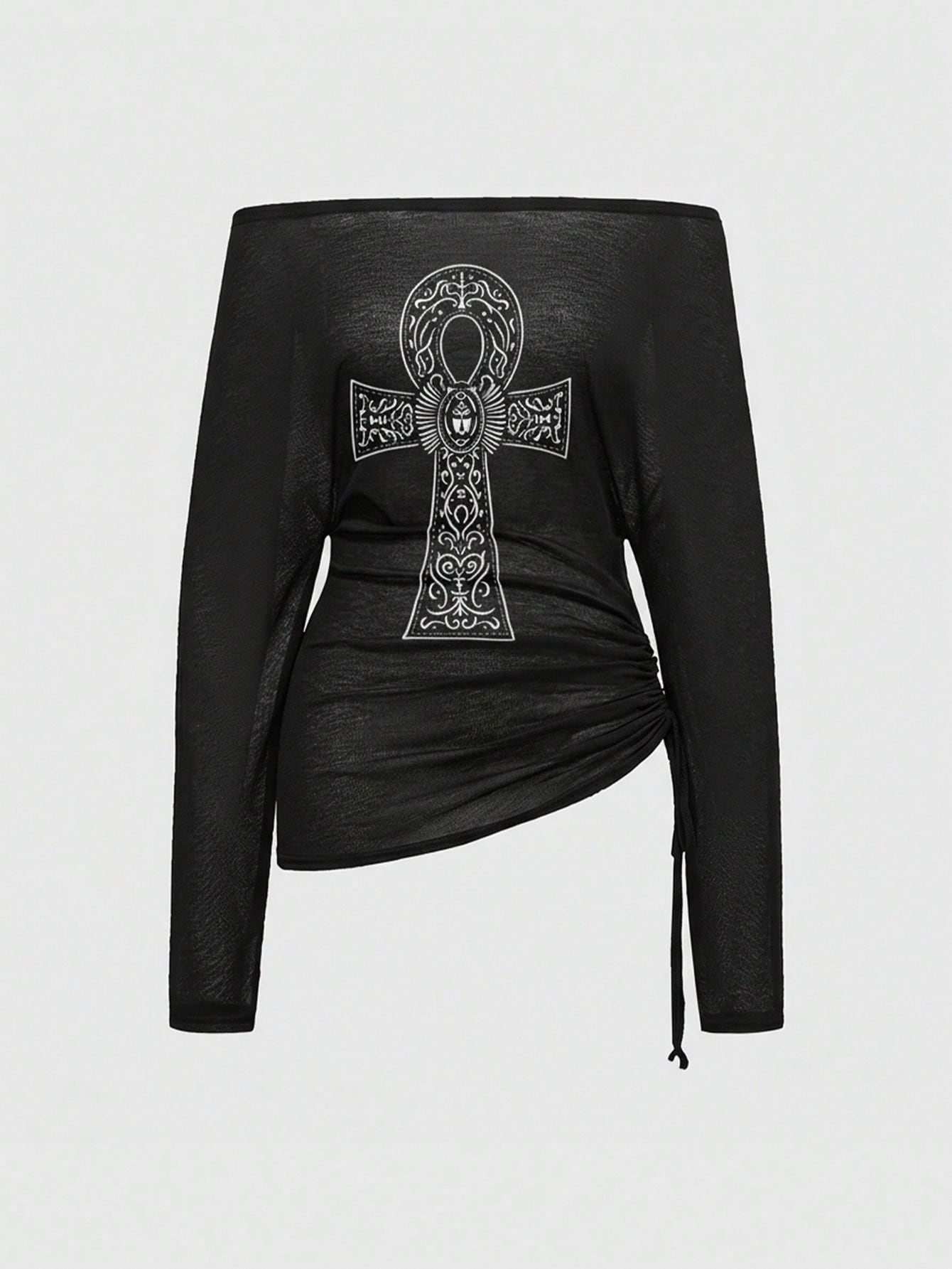 Goth بلوزة كبيرة الحجم بطبعة صليب رومانسية بانك، فضفاضة بأكمام طويلة وكتف مكشوف شفاف