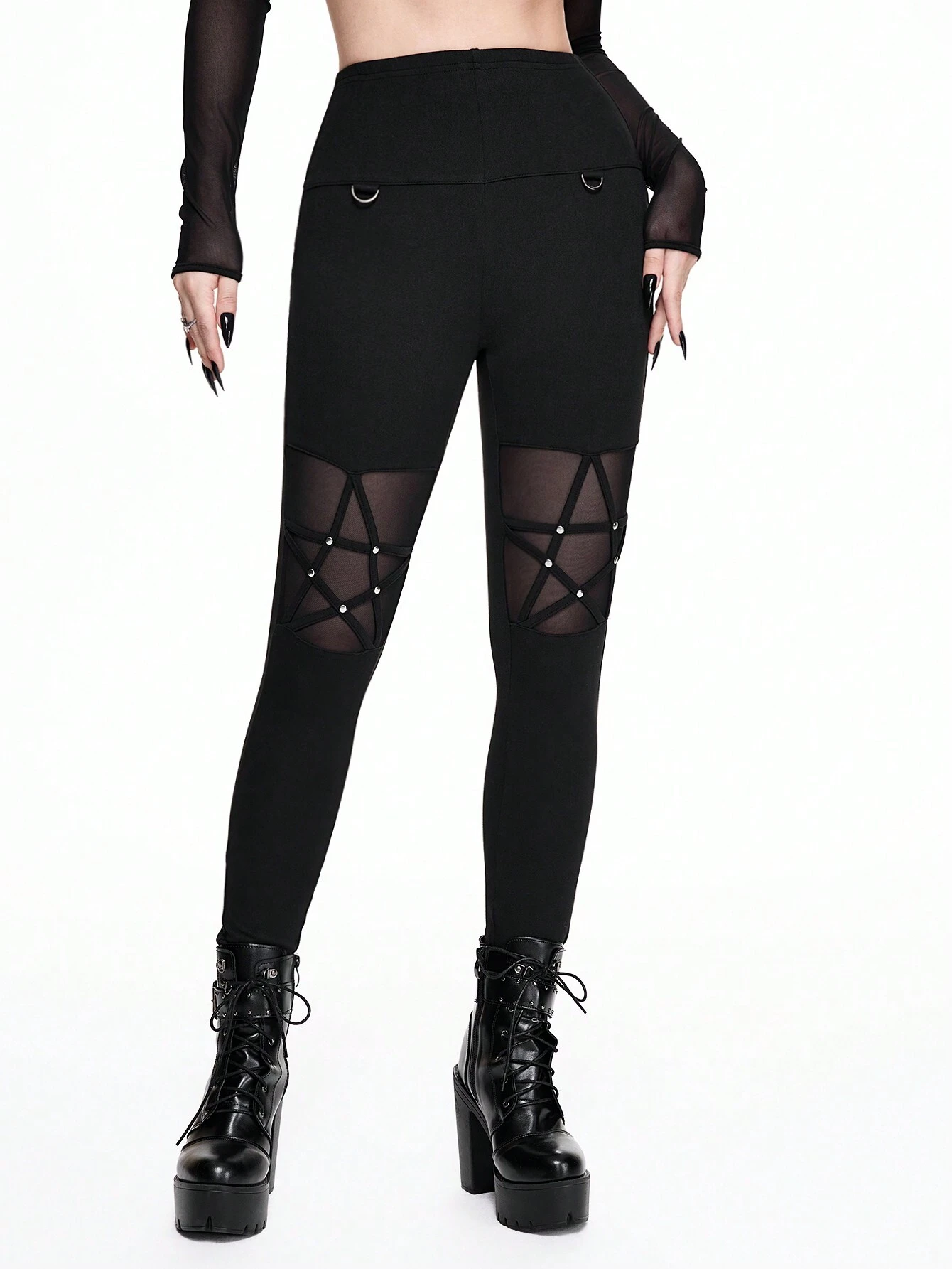 Goth سروال ضيق نسائي بنمط قوطي، إدراج شبكي ذو براطم بشكل نجمة خماسية الأضلاع