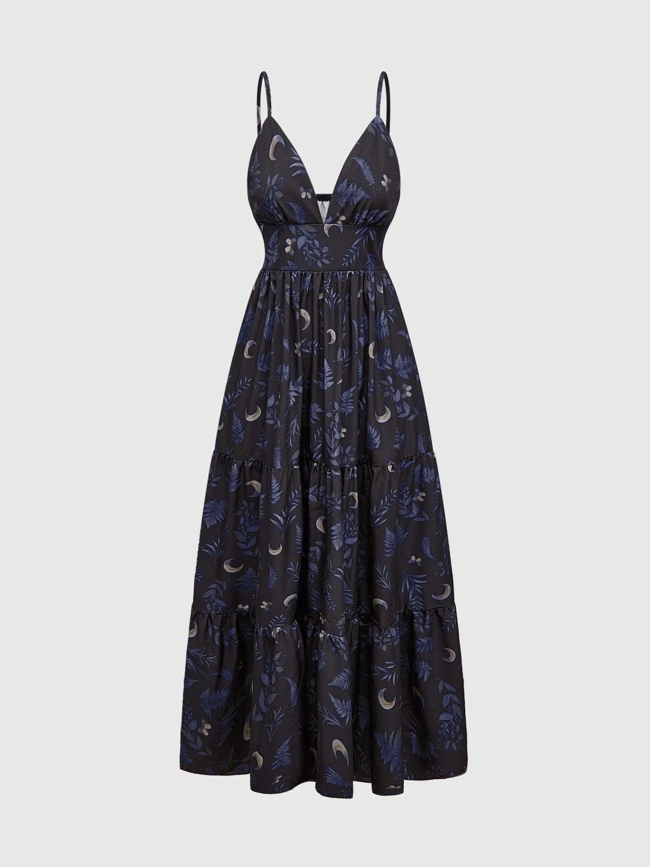Goth فستان ذو أشرطة خفيفة بطباعة كاملة للقمر والنبات على الطراز القديم