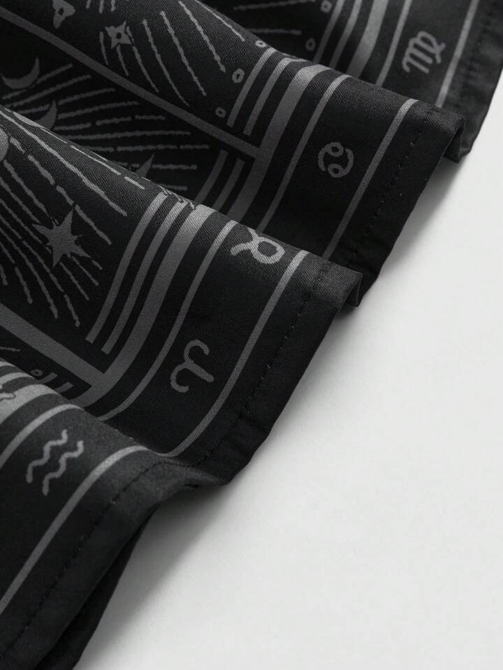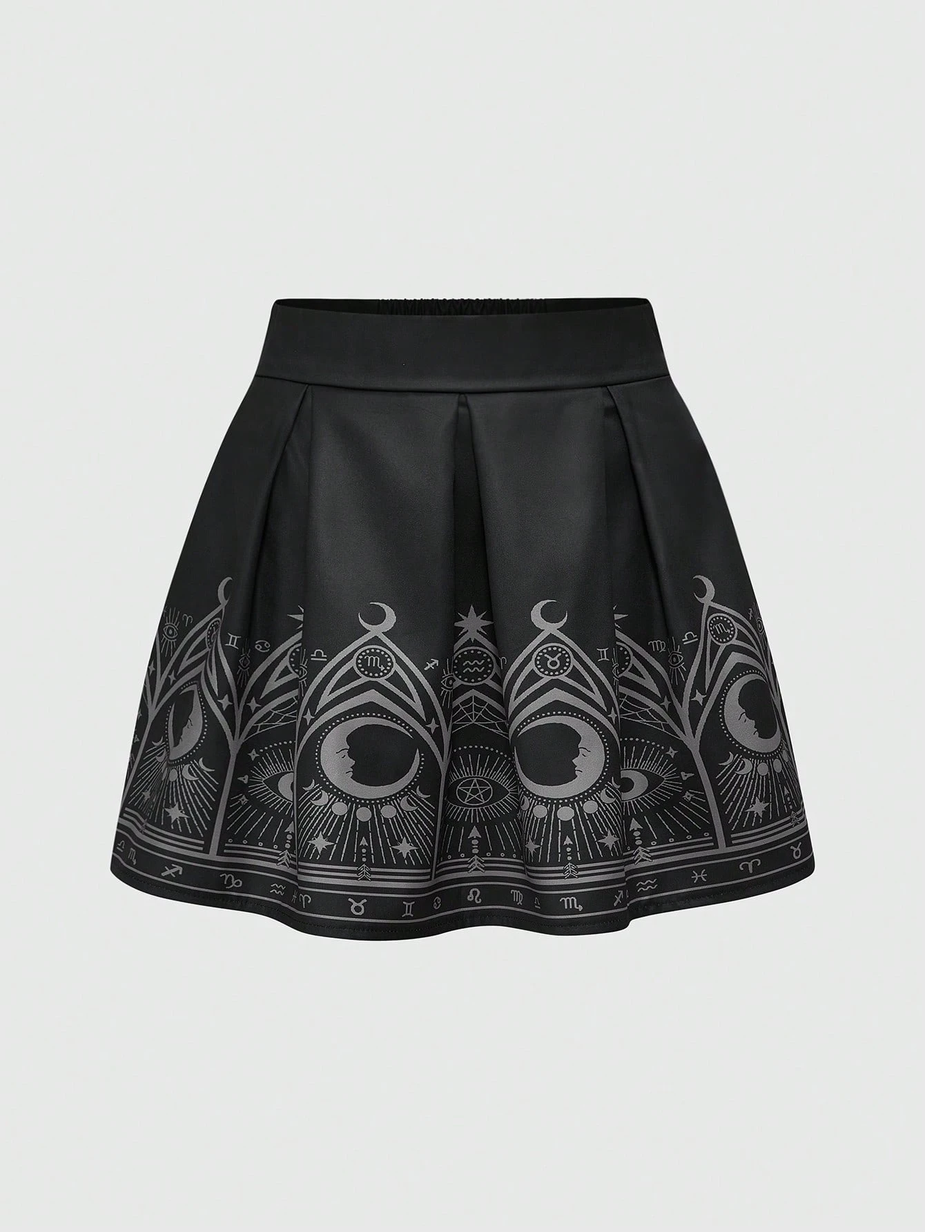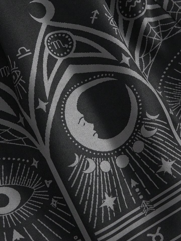 Goth تنورة قصيرة معقودة بطراز قصر كلاسيكي، مزينة بطباعة القمر والشمس والرمز السحري، بتصميم أزهار الكرز السوداء والرمادية