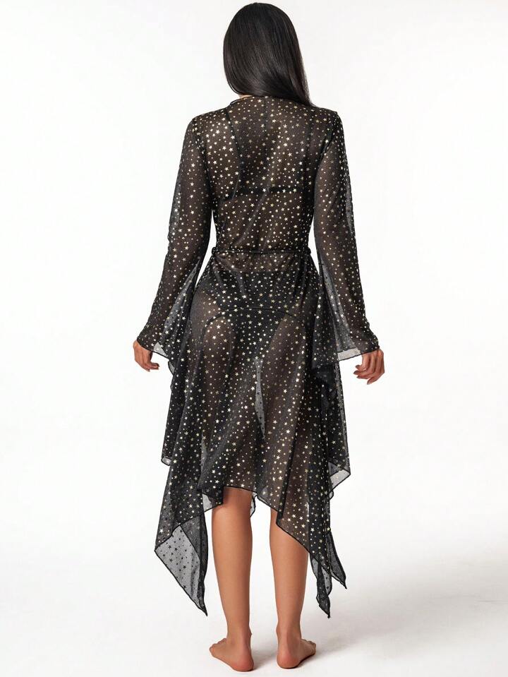 Goth كيمونو طويل مفتوح الأمام بأكمام واسعة وحاشية غير متماثلة مصنوع من قماش نجمي لامع، مناسب للصيف وعيد الهالوين