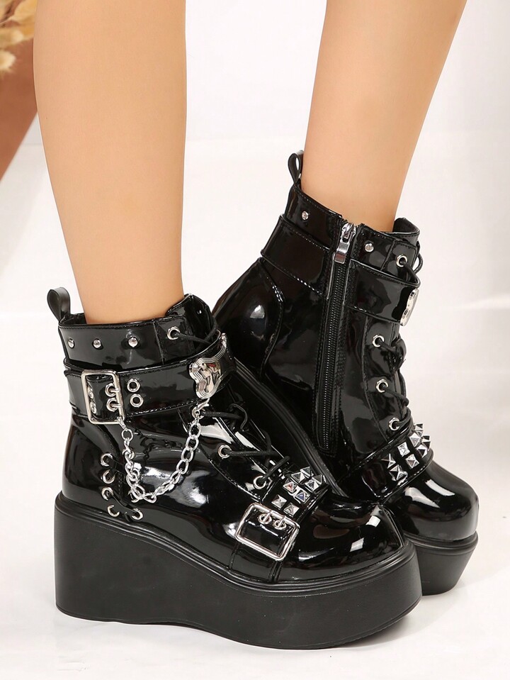 Goth نساء سلسلة & بديكور مشبك بسستة جانبي رباط امامي جزمة عسكرية , البونك خارجي جزمة برقبة طويلة
