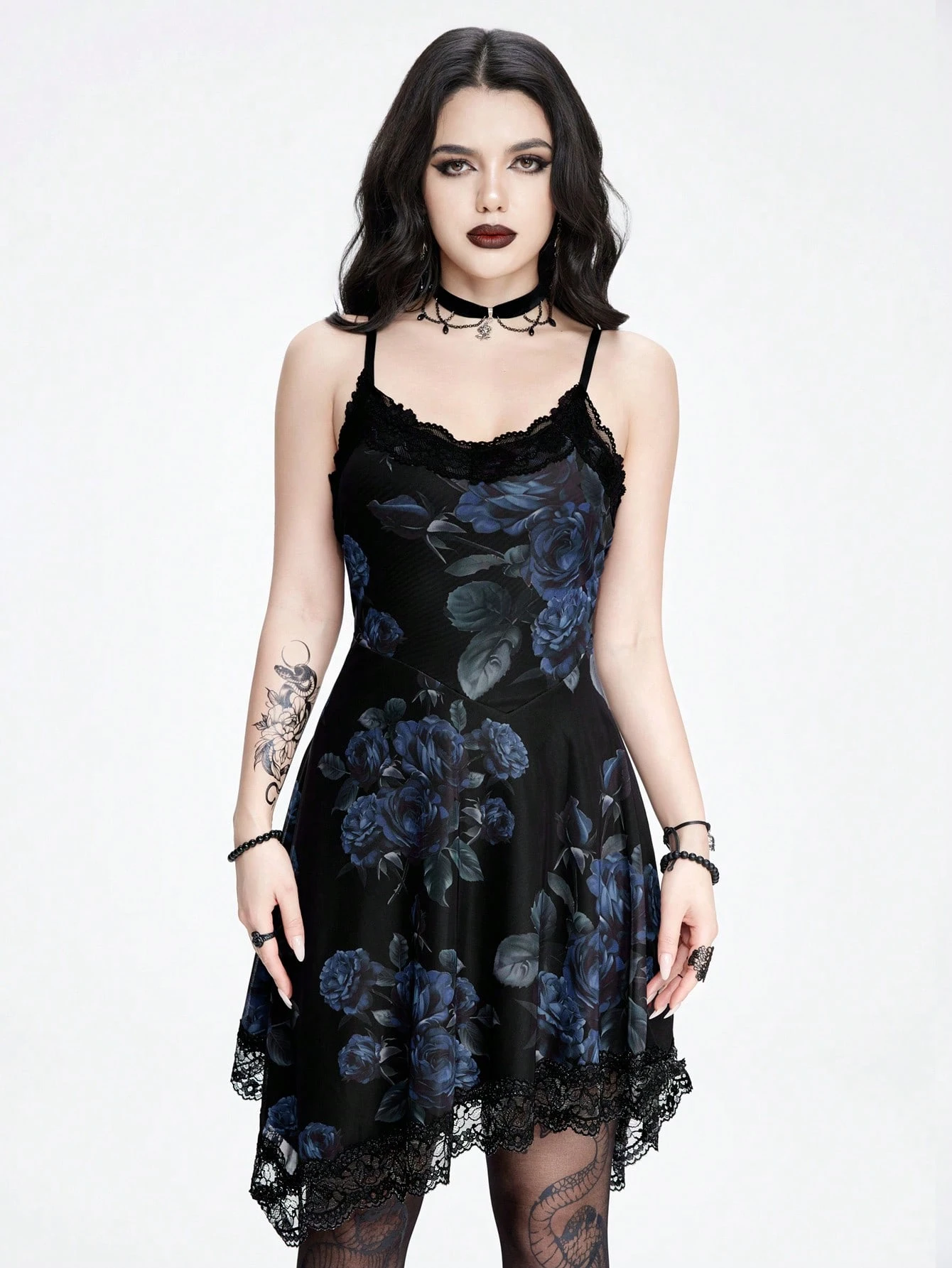 Goth فستان نسائي مطبوع بكامله بالورود مع حافة غير متماثلة مزين بالتطريز اللاكية