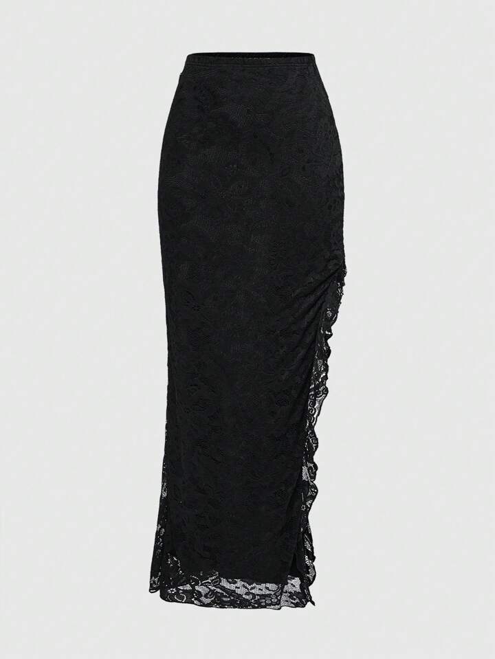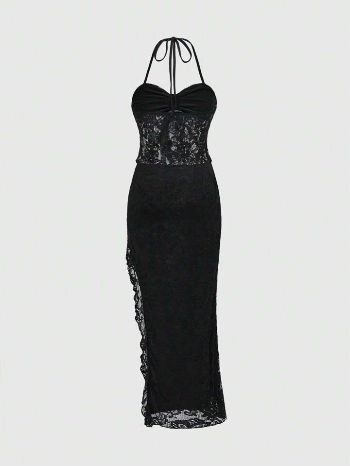 Goth طقم من قطعتين للسيدات، ملابس علوية عارية الظهر من الدانتيل ذات رباط في الرقبة والتنورة عالية الشق