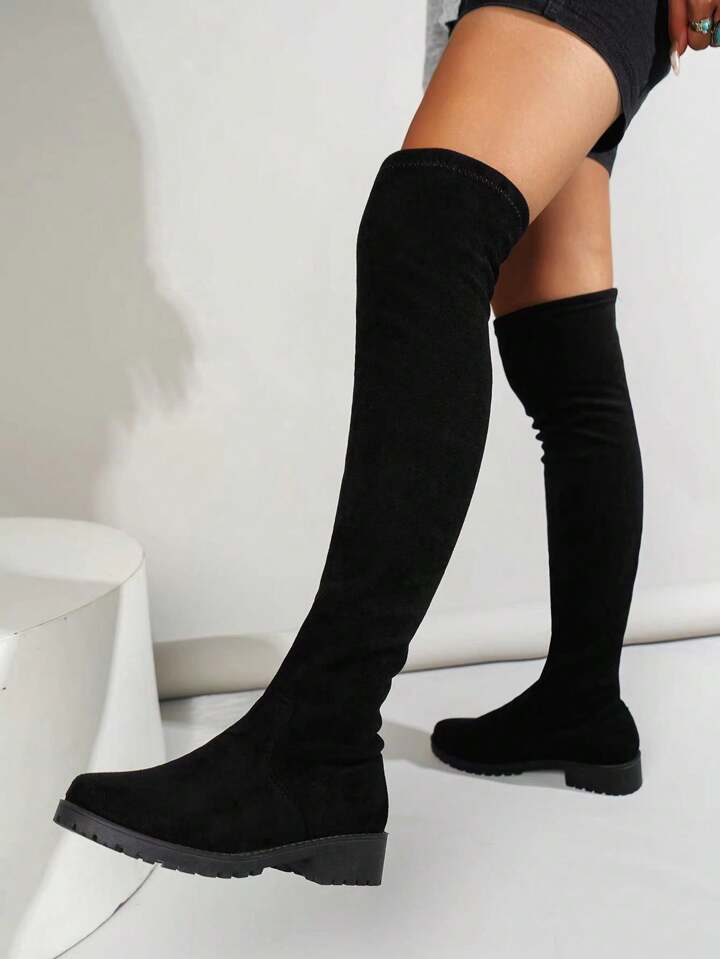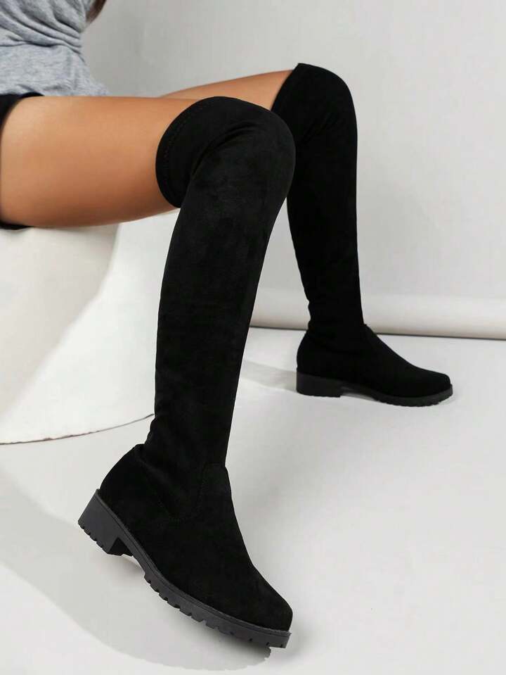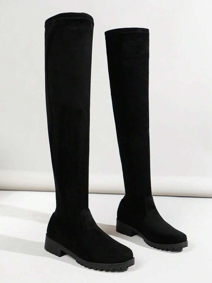 Goth بوت نسائي فوق الركبة جديد لعام 2024 بأصبع مستدير أسود ونعل سميك مع تصميم تجاعيد مرنة للربيع / الخريف