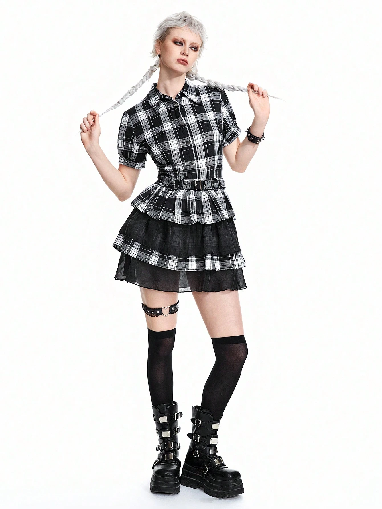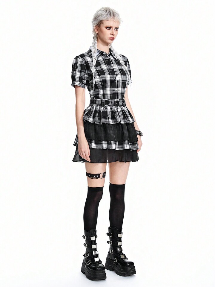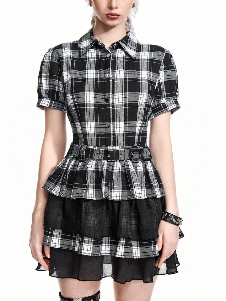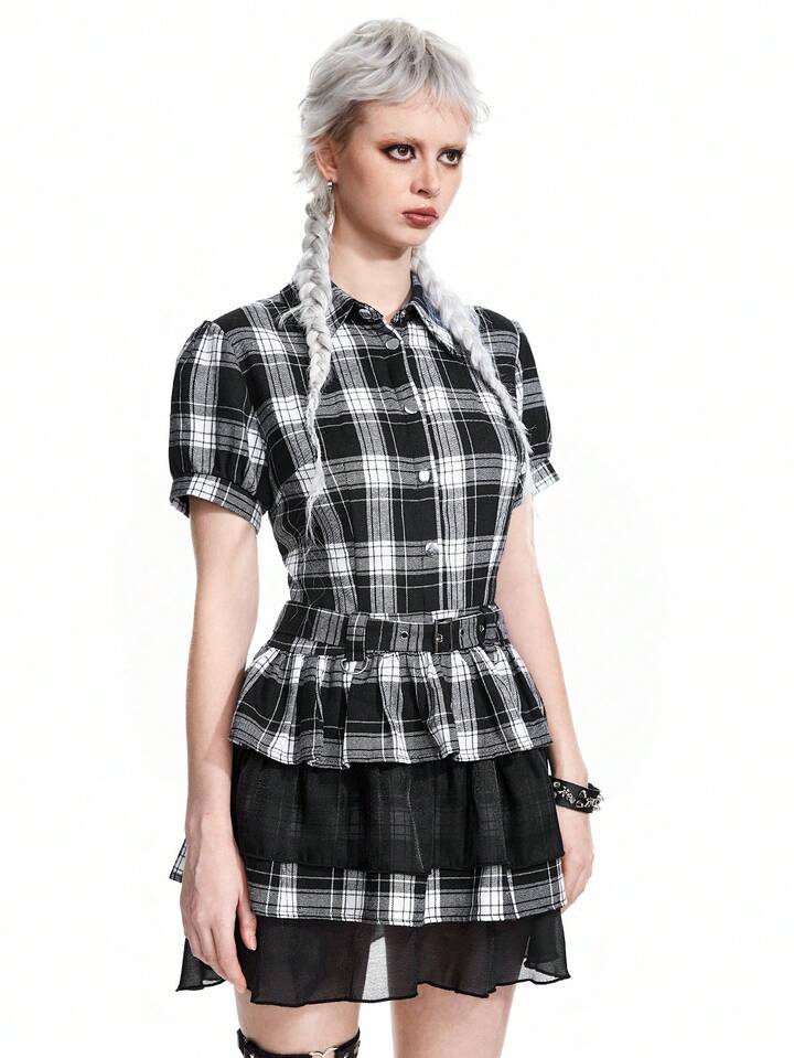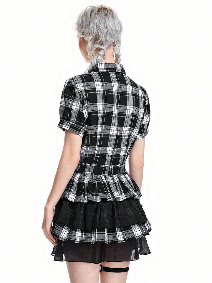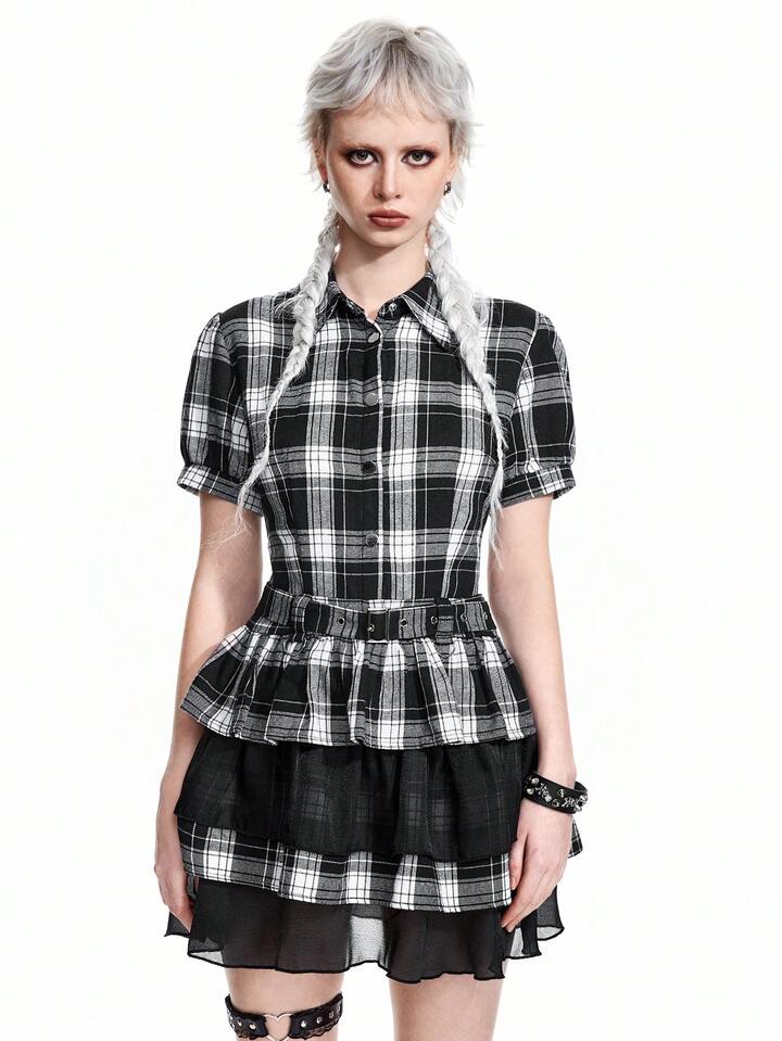 Goth فستان قميص به طبقات متعددة من الكشكشة بنقشة أسود وأبيض للنساء