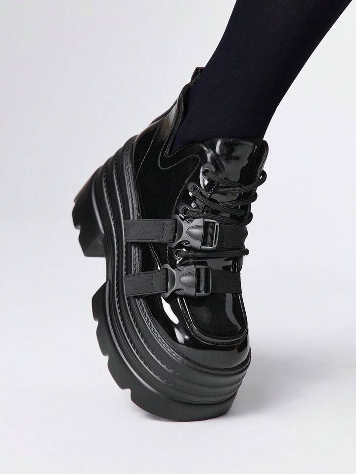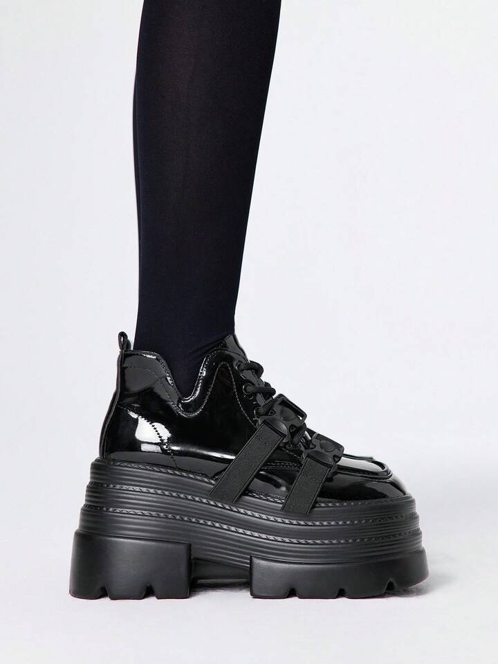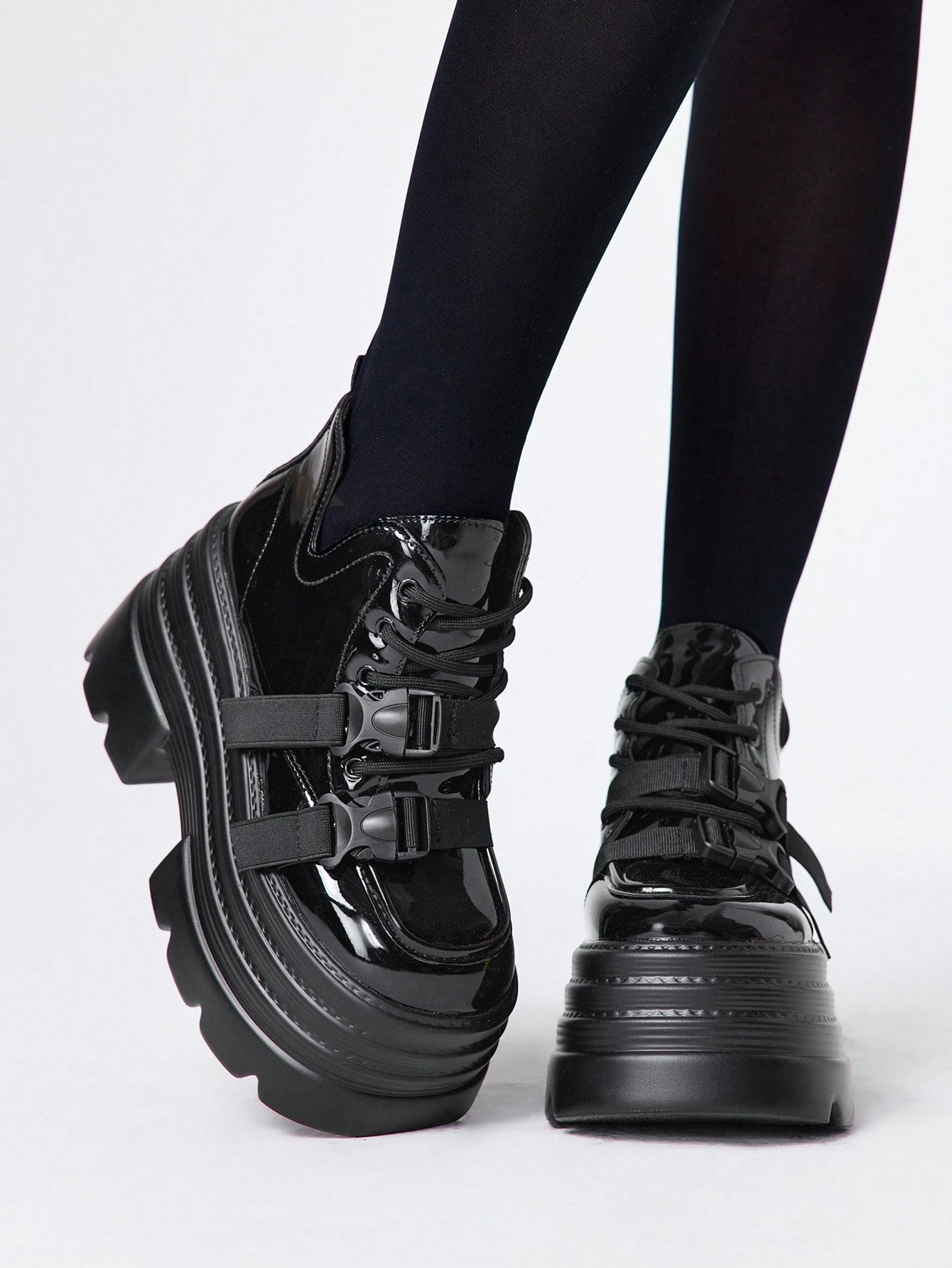 Goth نساء موضة تصميم إبزيم أسلوب بانك كاجوال كعب منحدر وحذاء لوفر بمنصة