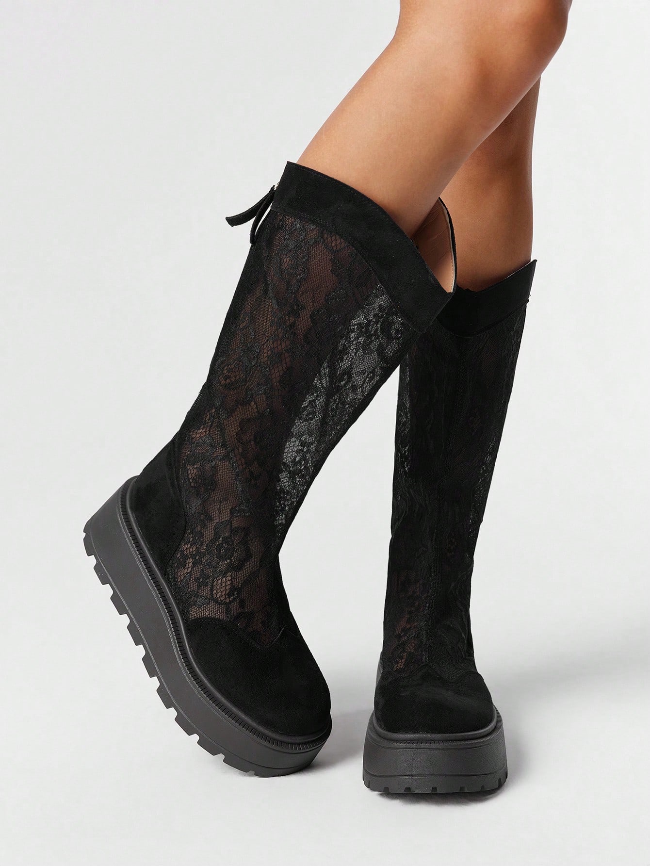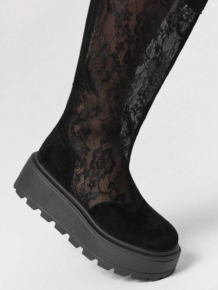 Goth بوت ركوب طويلة رفيعة للصيف باللون الأسود، مصنوعة من شبكة تنفس مع تفاصيل من الدانتيل والفتحات، مناسبة للنساء