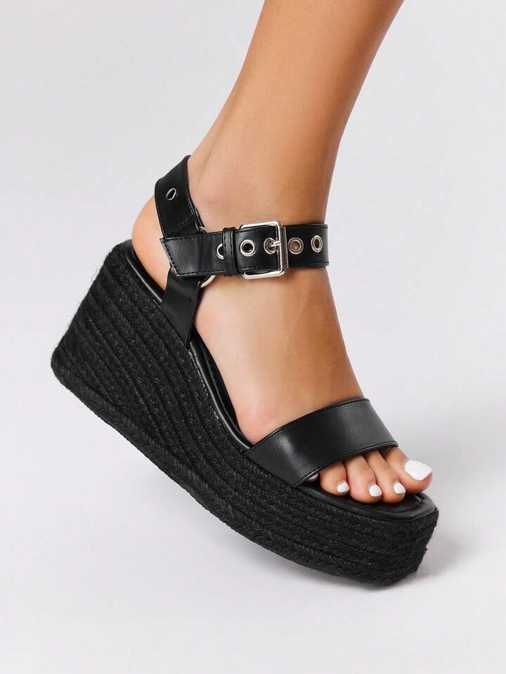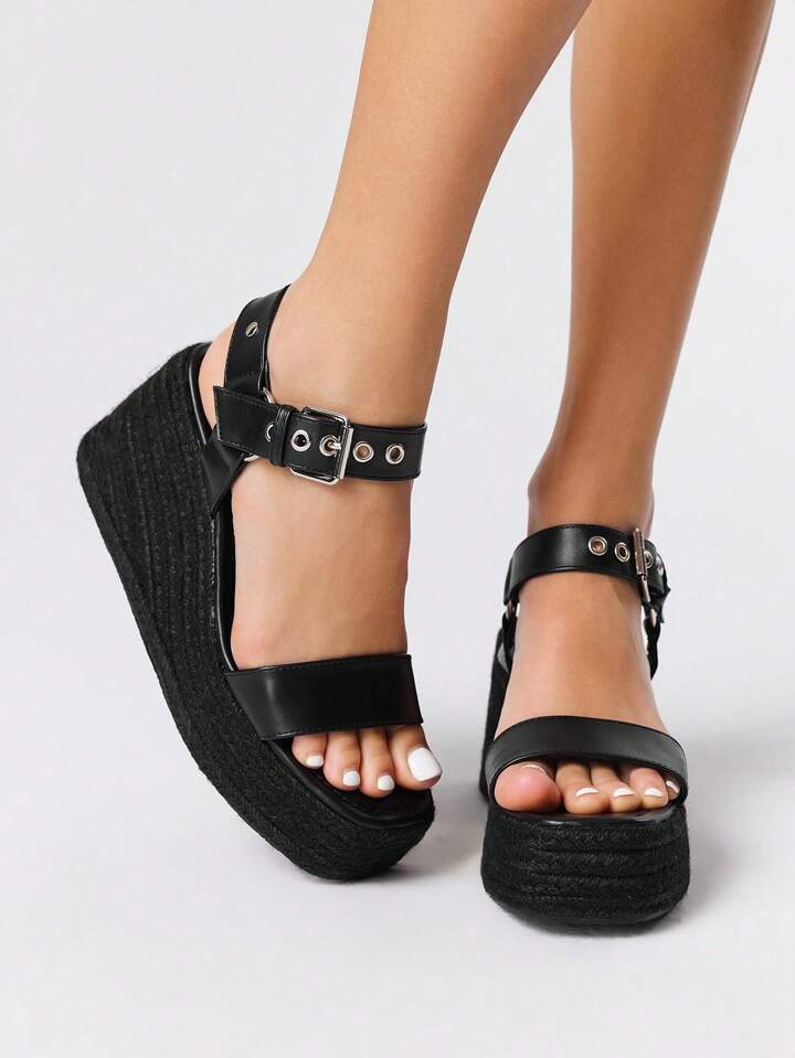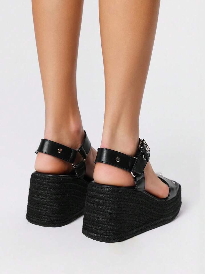 Goth صنادل كعب مرتفع ذات طراز بانك أسود مزود بأشرطة رومانية وإبزيم معدني مقاوم للماء وقاعدة سميكة وكعب عالي وأصابع مفتوحة للصيف
