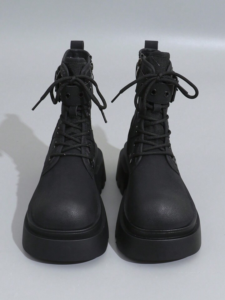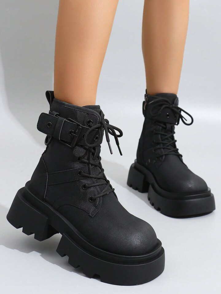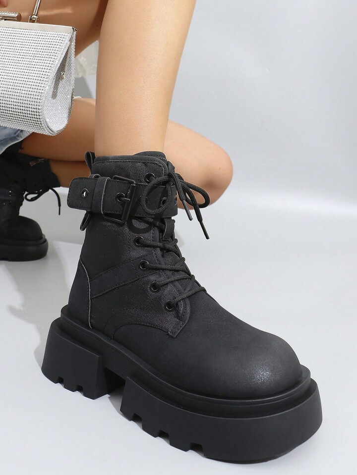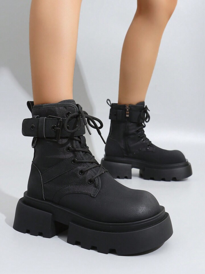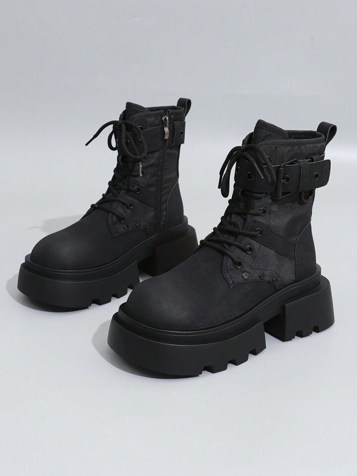 Goth بوت برقبة الكاحل السميكة الدافئة ذات البداية المنزلقة والحزام الدانتيل على الظهر، رأس مستدير، بلون أسود ولحاقات متعددة الألوان للنساء