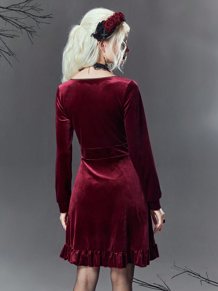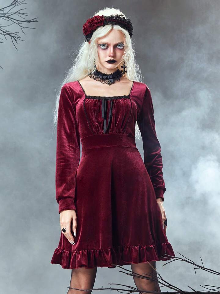 Goth فستان نسائي بياقة مربعة وأكمام طويلة وحزام من الفلينت