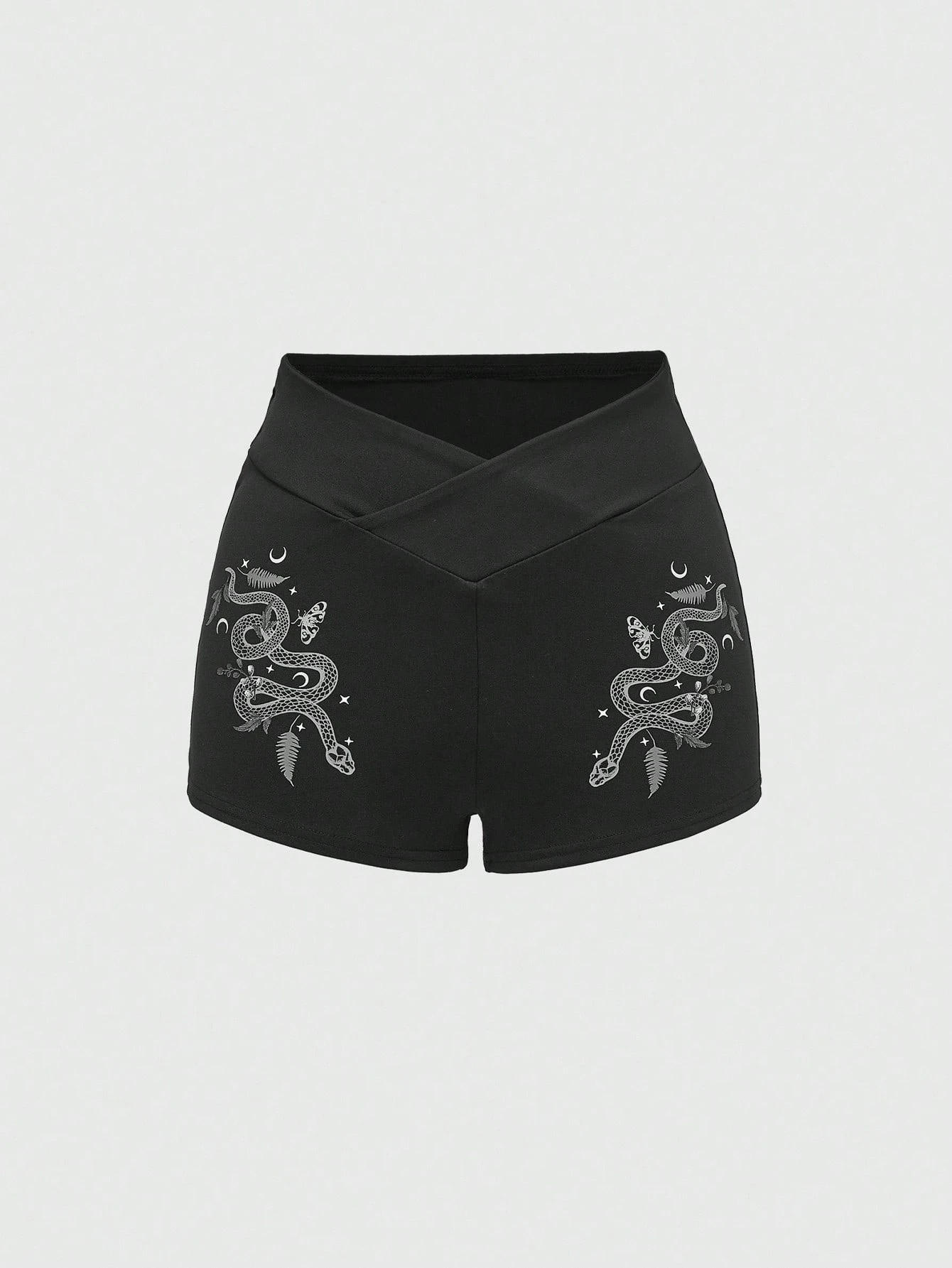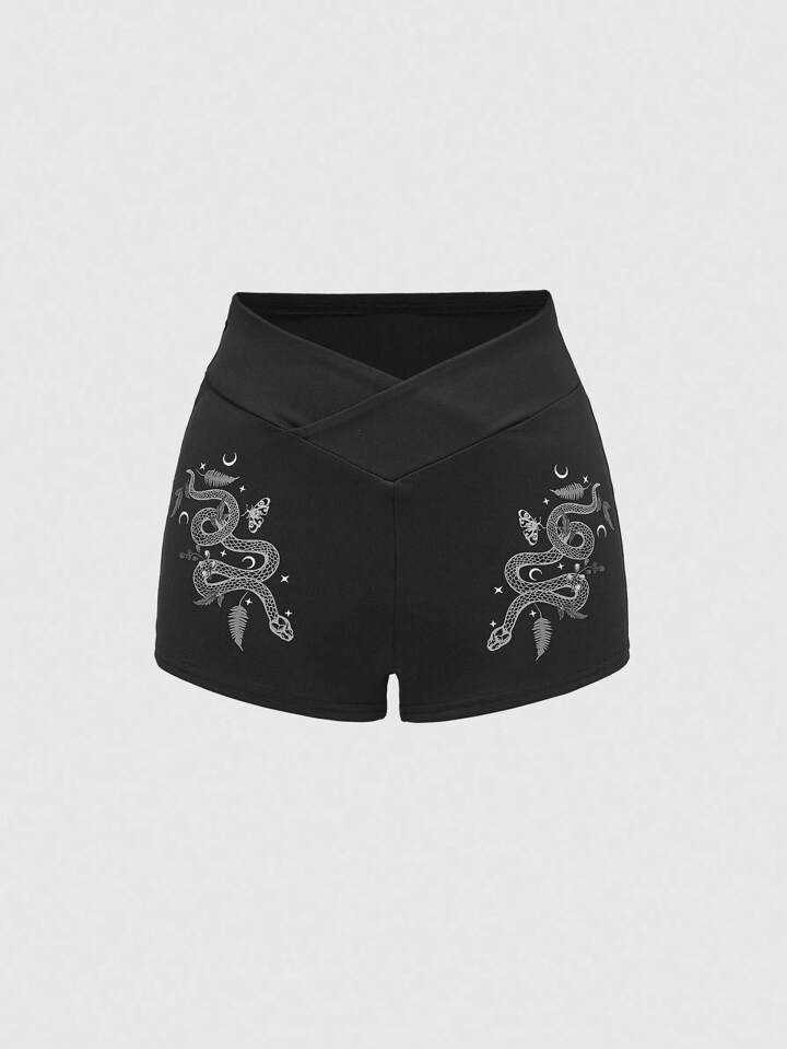 Goth سراويل درجة ثانية للنساء مطبوعة بطبعات الأفعى والنباتات الاستوائية، خصر متداخل لركوب الدراجات