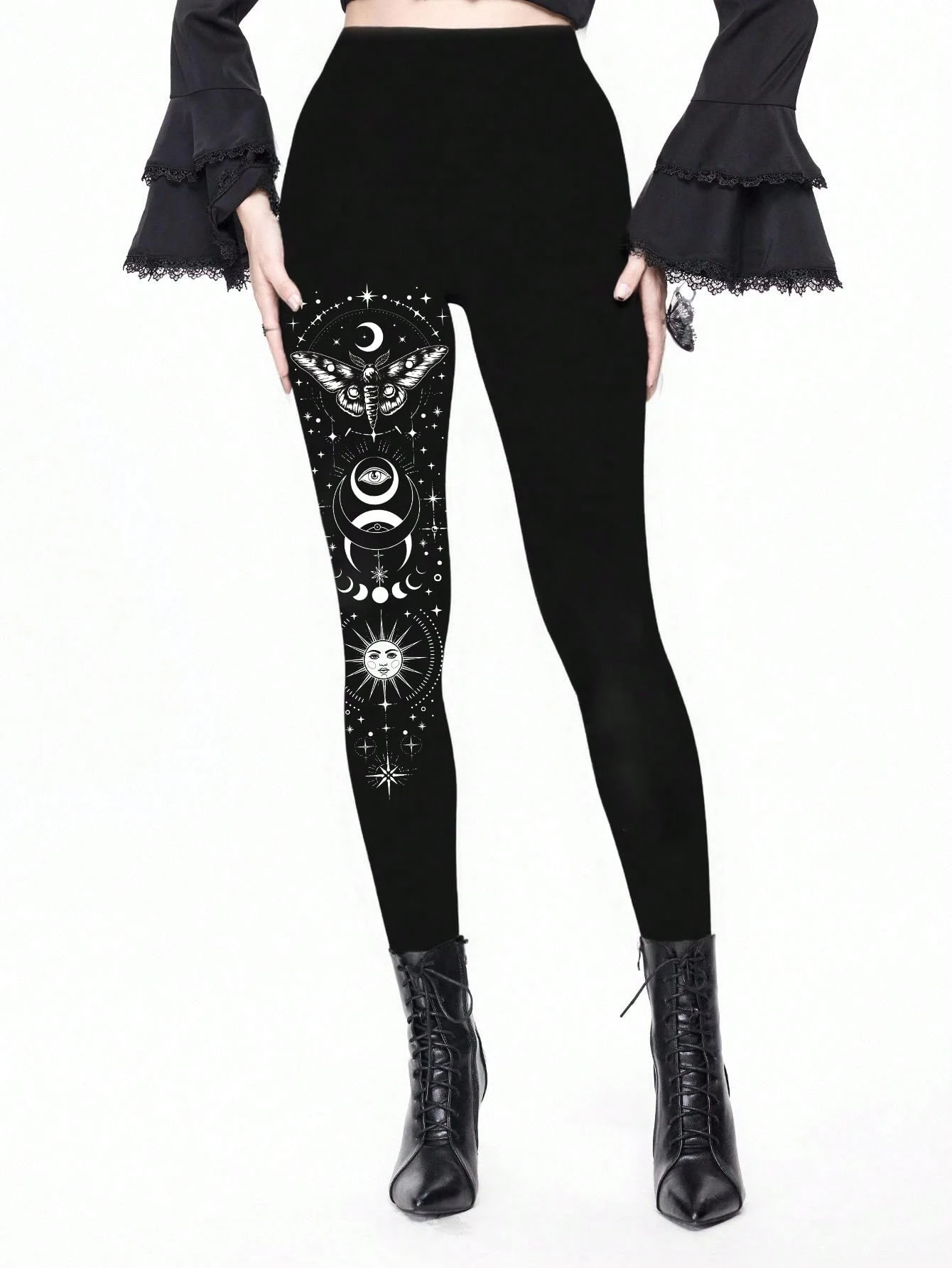 Goth سروال ضيق سيكسي غامض للنساء مطبوع بتصميم الفراشة والشمس والقمر
