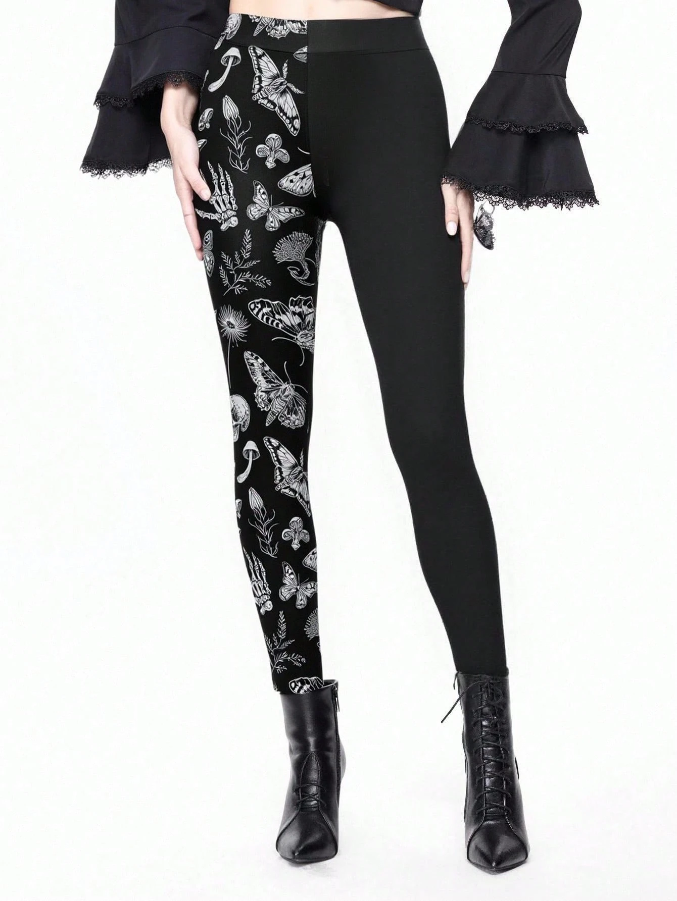 Goth سروال ضيق جوتي للنساء مزين بالفطر والجمجمة والشمس والقمر والنجوم والخفافيش والفراشات والنباتات