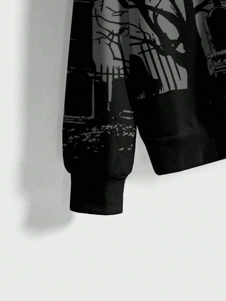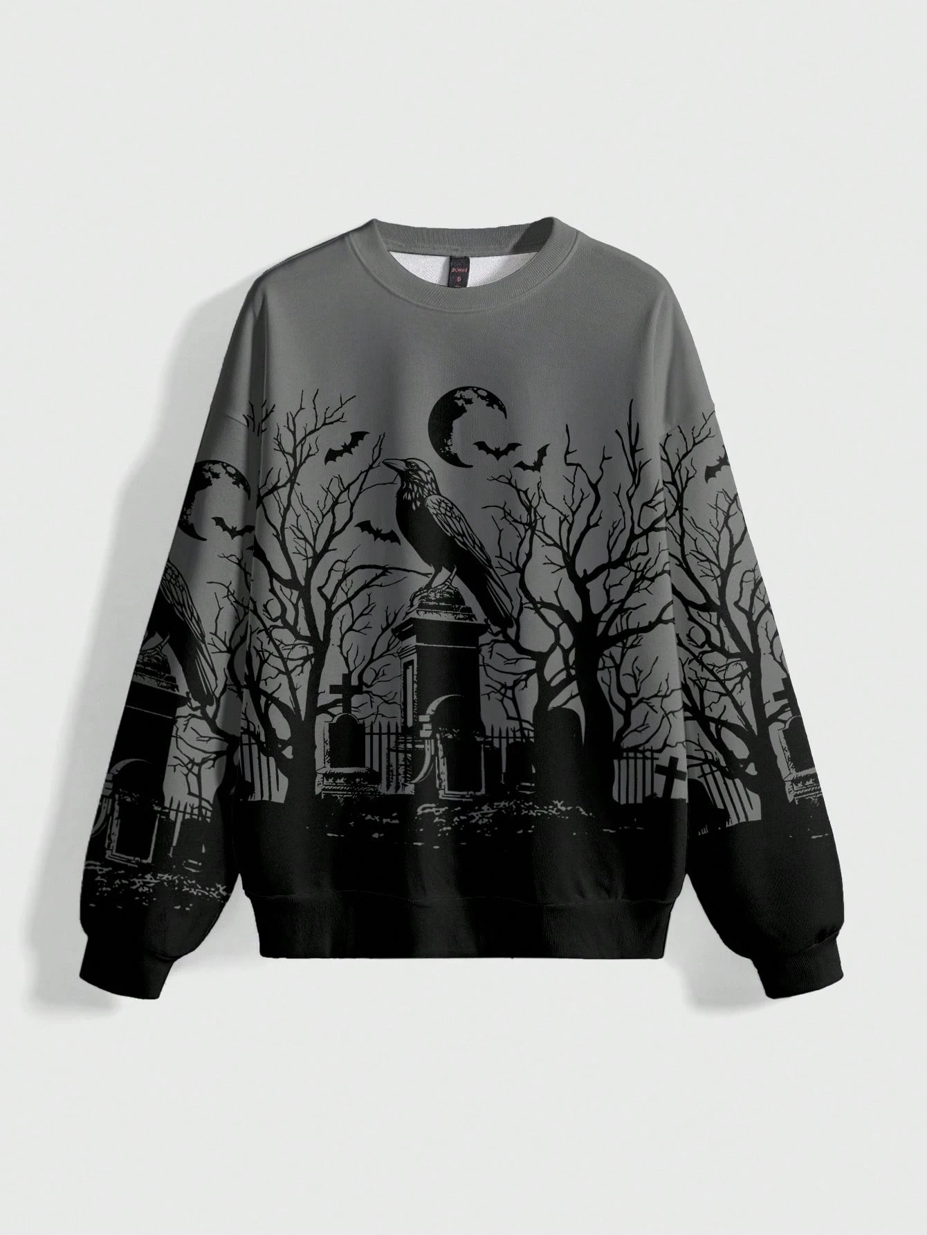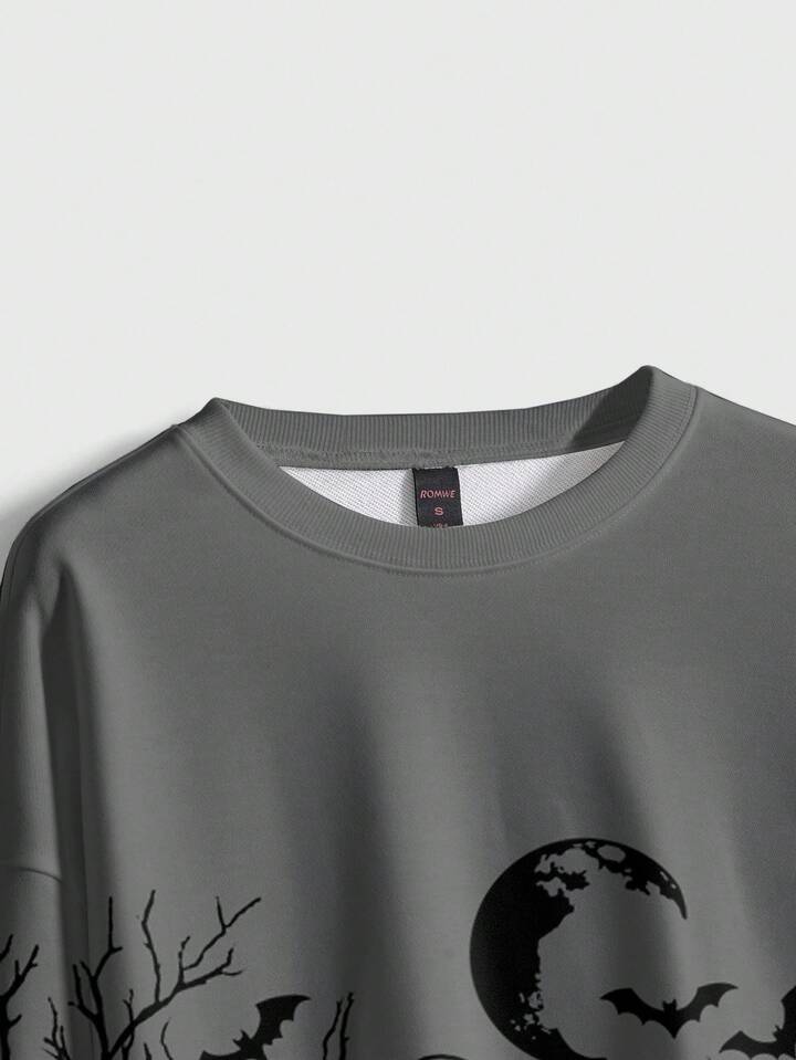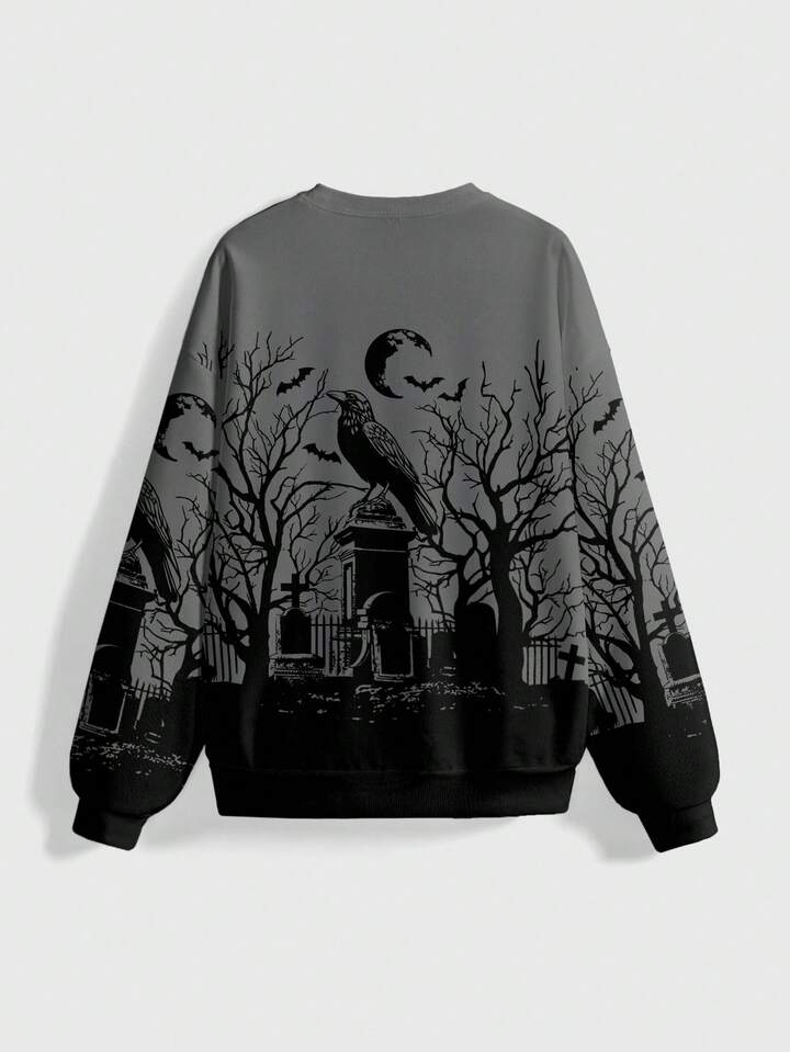 Goth بلوزة رياضية بأكمام طويلة مطبوعة بالكامل بتصميم الغراب والقمر والنجوم والصليب والخفافيش ذات طابع غوثي وغامض للنساء، مناسبة للخريف والشتاء والربيع