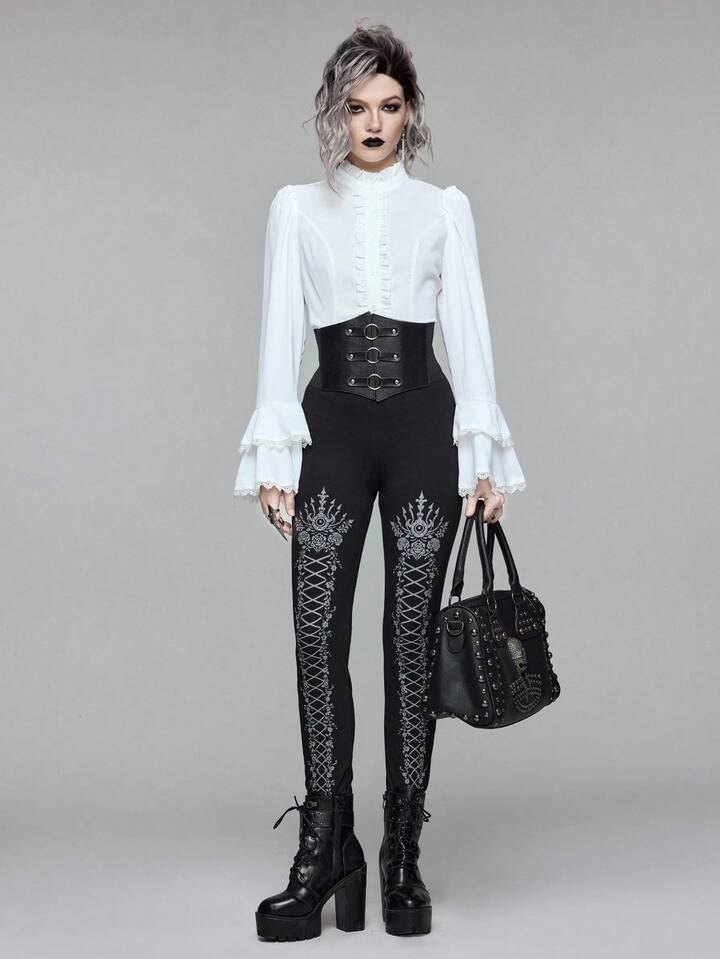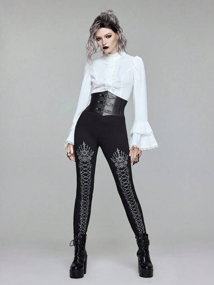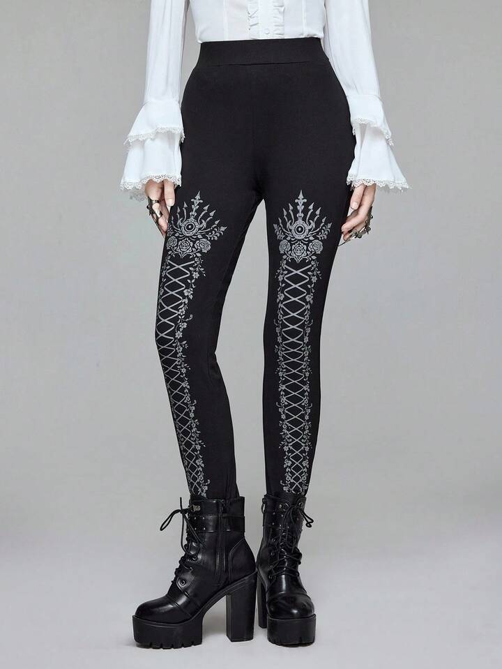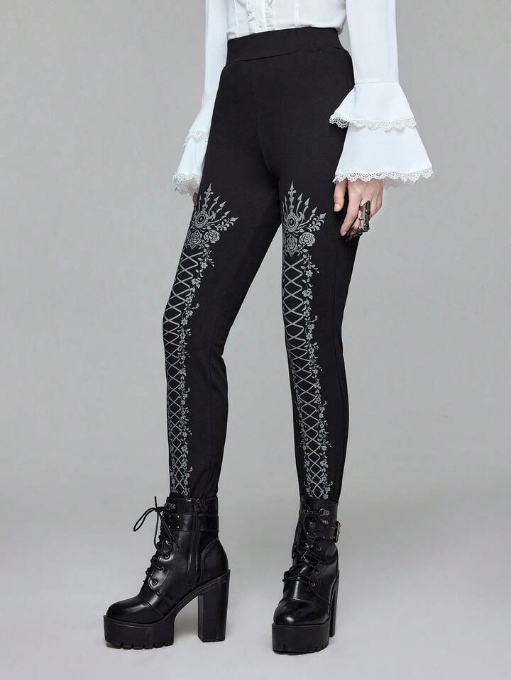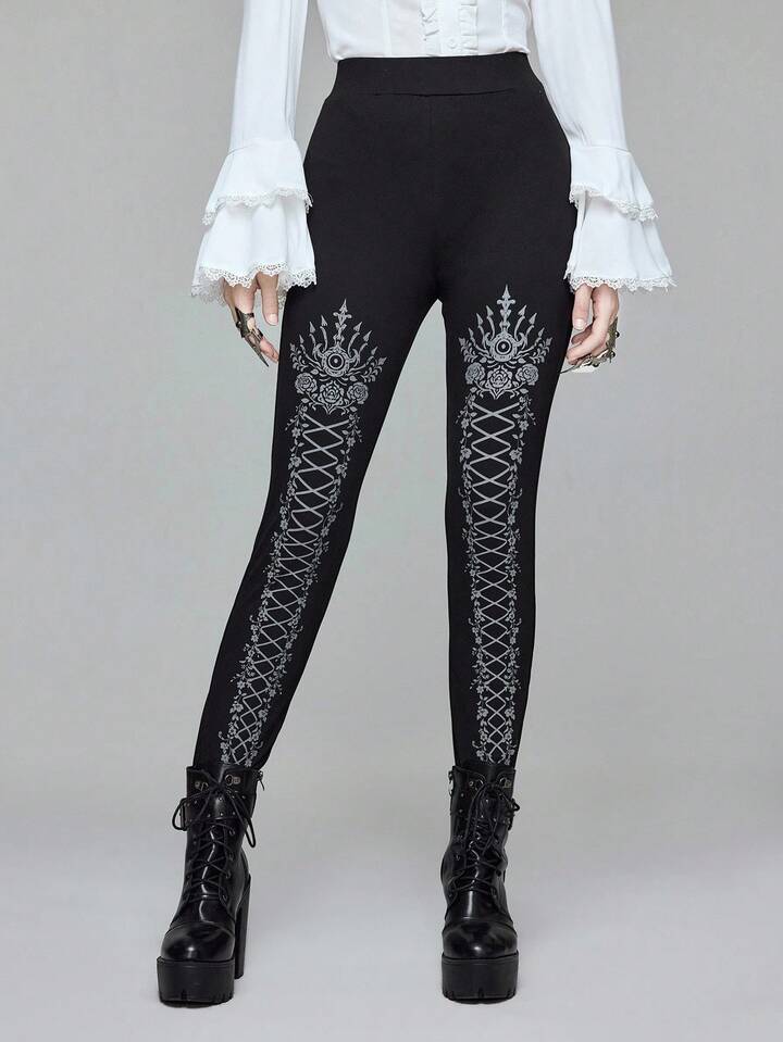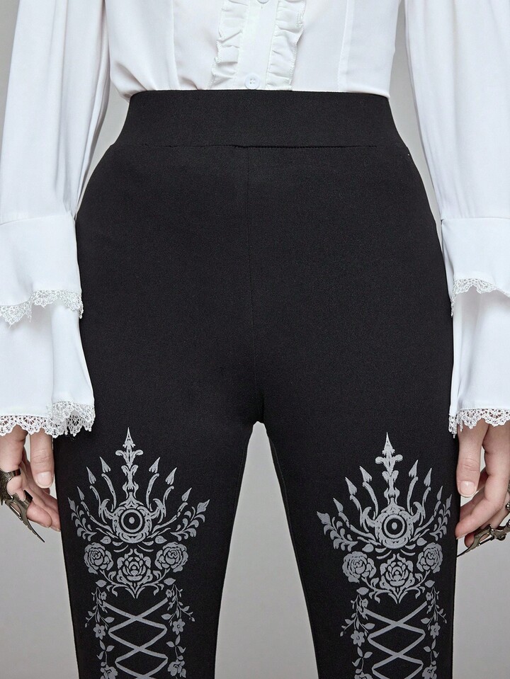 Goth سروال ضيق مطبوع بطراز الدانتيل الأسود الجوتي، مناسب لمناسبة هالوين